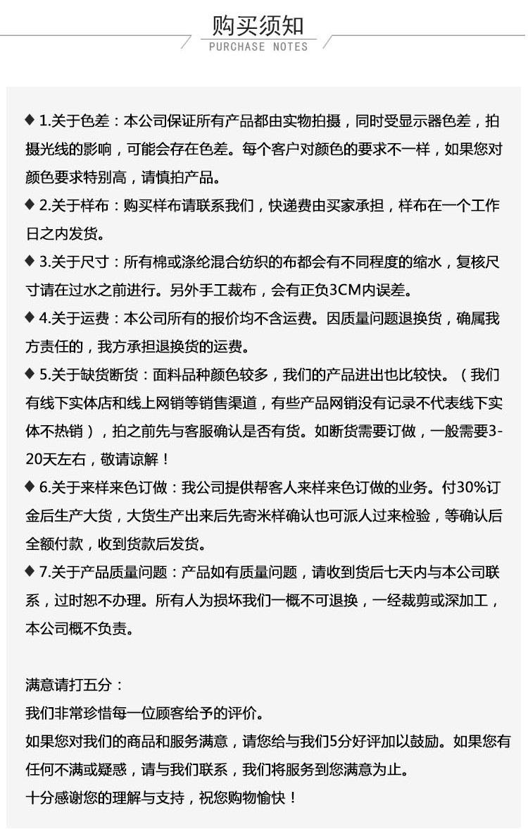 5.Sobre fora de estoque:Existem muitas variedades e cores de tecidos, e nossos produtos entram e saem rapidamente. (Temos lojas offline e canais de vendas online. Alguns produtos não têm registros de vendas online, o que não significa que não sejam populares offline). Antes de fazer o pedido, confirme com o atendimento ao cliente se há estoque. Se estiver fora de estoque e precisar ser personalizado, geralmente requer3-20Demora cerca de 2 dias, por favor, entenda!