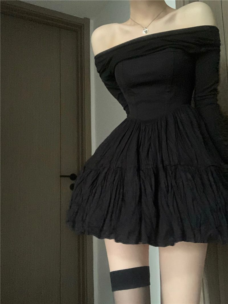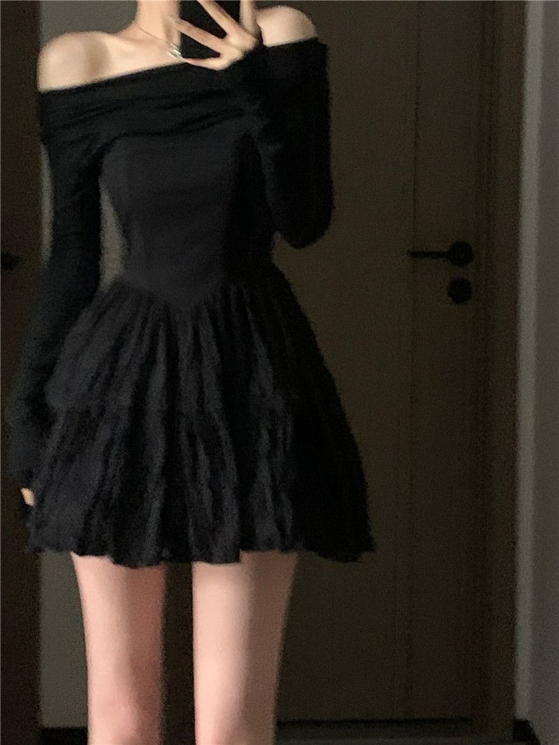 Saia curta fina de nicho de um ombro temperamento design preto saia plissada em linha A vestido de manga comprida primavera e outono feminino === O produto real foi melhorado, o design plissado não é tão forte, tenha cuidado se você se importar