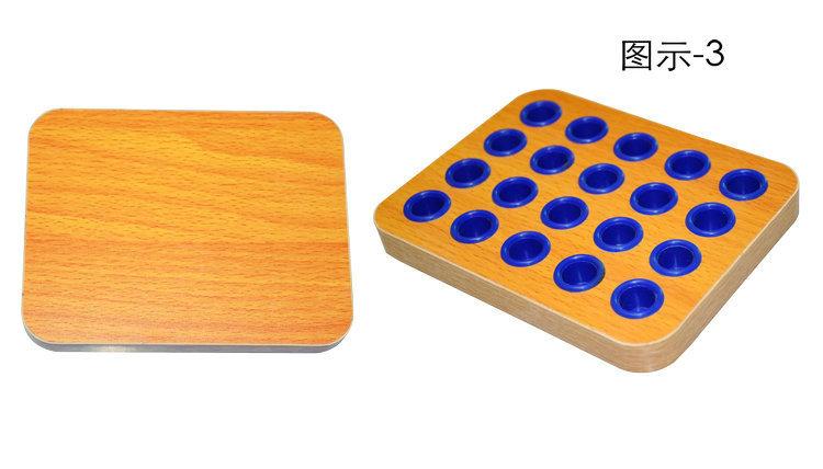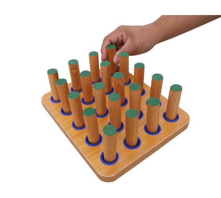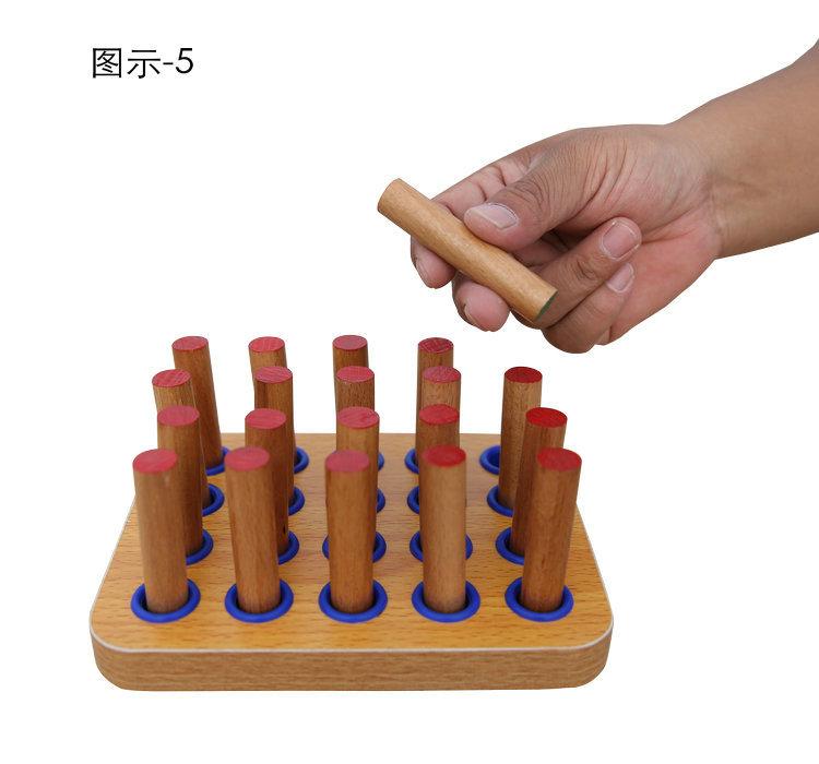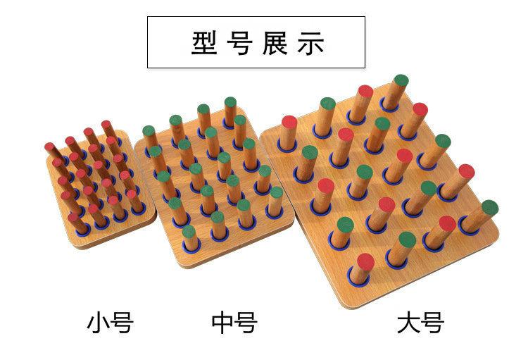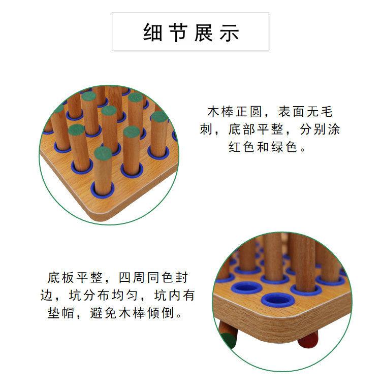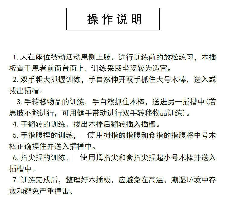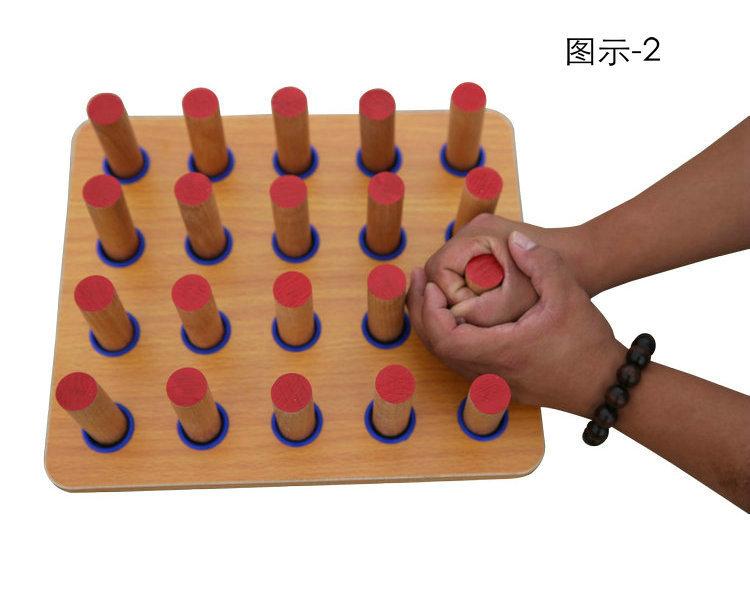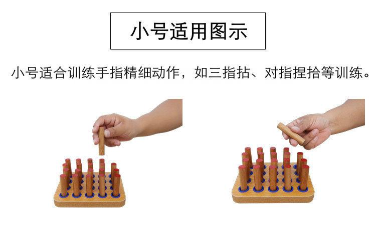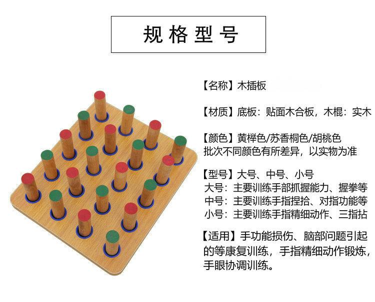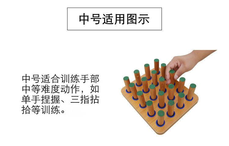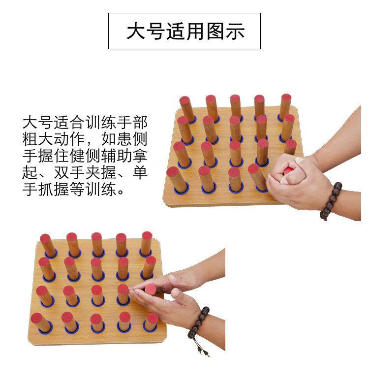 El tablero de clavijas de madera se utiliza para ejercicios de rehabilitación. A través de una serie de acciones: usar diferentes dedos para cooperar, sacar e insertar palos de madera, cambiar los agujeros de los palos de madera, sacar y luego voltear e insertar, recoger los palos de madera designados, se mejora la capacidad de control de los dedos y las extremidades superiores, y se mejora la coordinación mano-ojo.