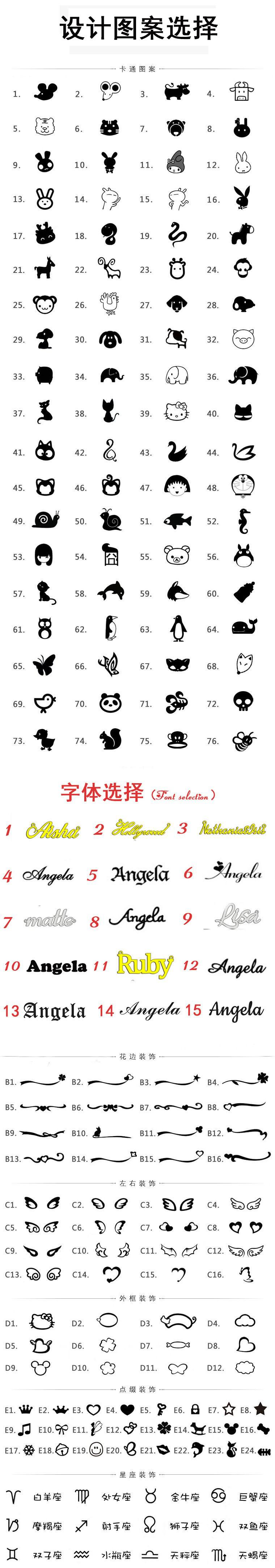personalizado: Forneça o conteúdo que você deseja personalizar, caracteres em inglês/chinês são aceitáveis, você pode adicionar outros padrões pequenos, os padrões pequenos são mostrados abaixo, entre em contato com o atendimento ao cliente para obter detalhes. Produtos personalizados não são reembolsáveis ou trocáveis.