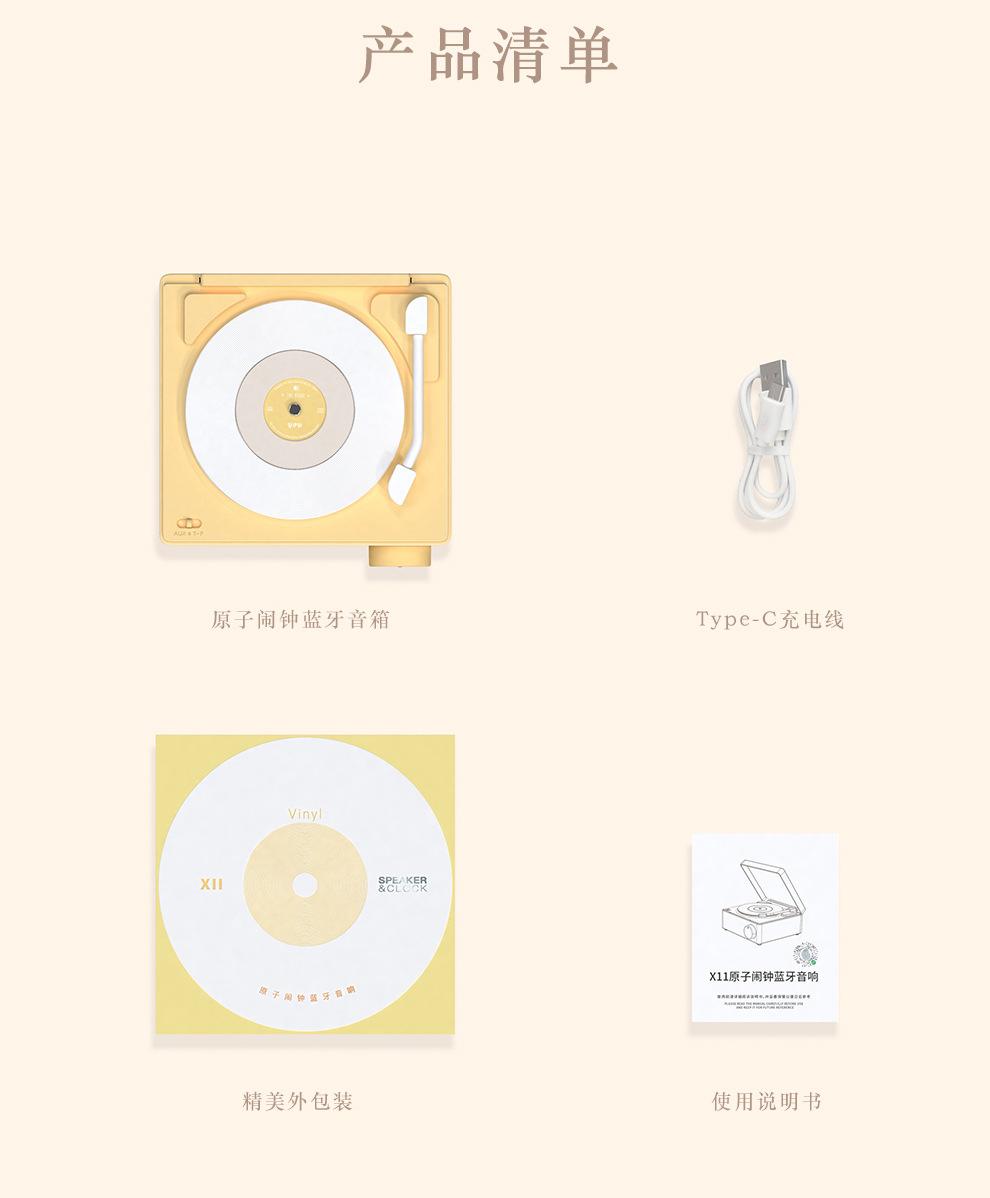 Acessórios de embalagem: corpo do alto-falante Bluetooth do despertador atômico, manual de instruções, cabo de áudio, cabo de carregamento tipo C, certificado de conformidade, cartão de garantia
