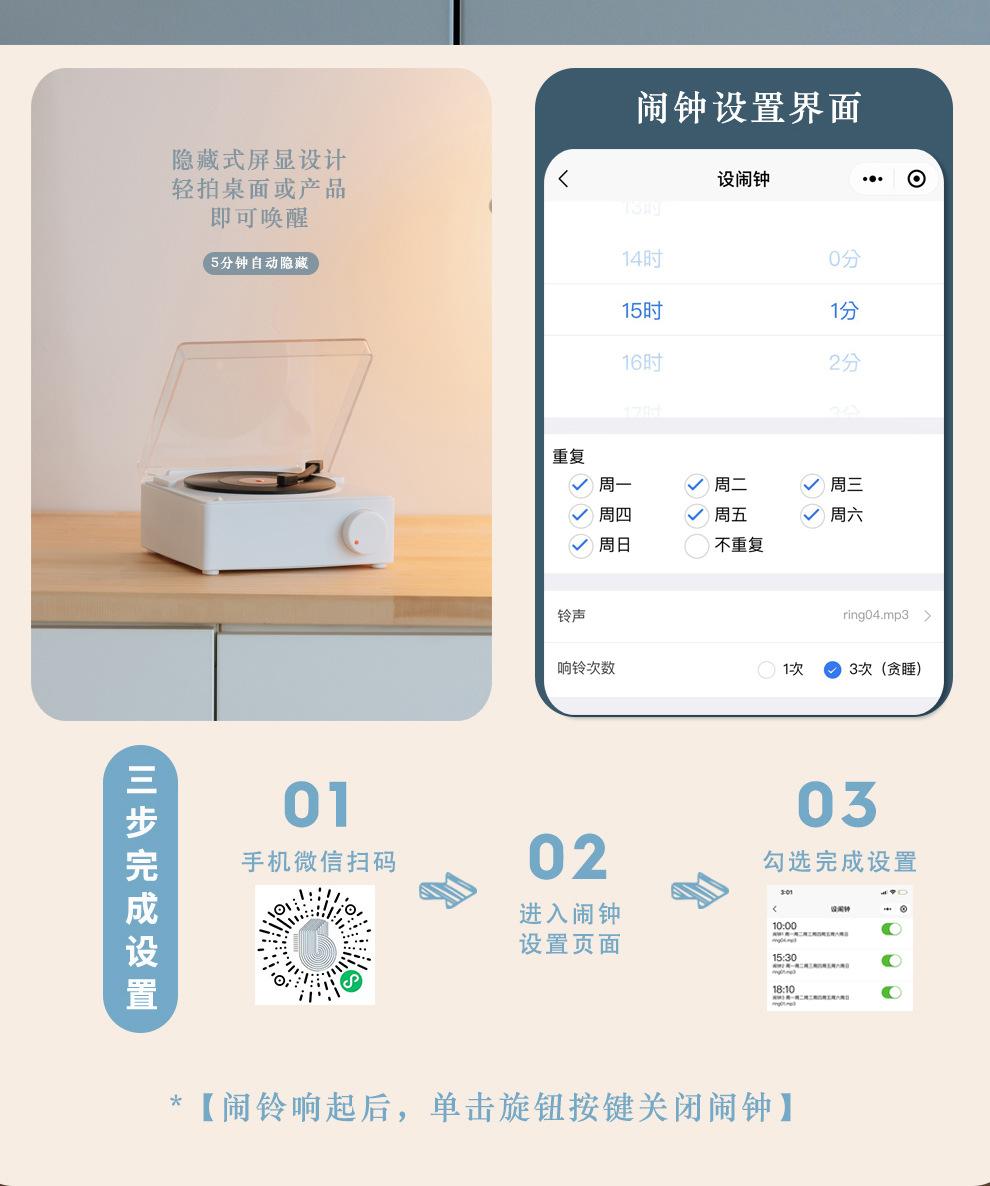 Abra o WeChat no seu telefone, escaneie o código QR (ou procure o miniaplicativo WeChat: Retro Light Luxury Smart Alarm Clock), clique para entrar no miniaplicativo, após entrar na interface, abra o despertador atômico, conclua a configuração de hora do dispositivo e você pode definir três conjuntos de alarmes na interface de fundo