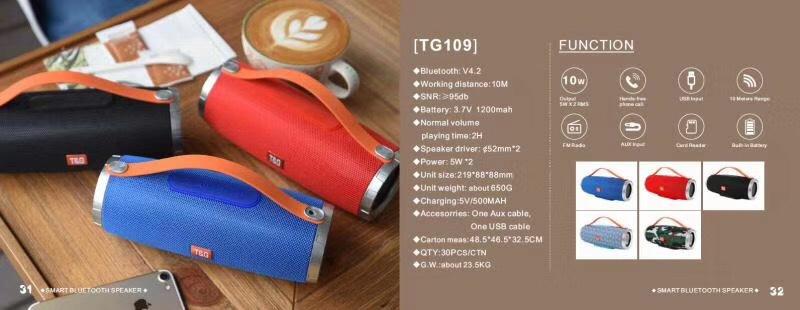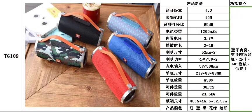 Altavoz Bluetooth Impermeable Doble Diafragma Portátil para Exteriores Altavoz Bluetooth con Tarjeta TG109 Altavoz Pequeño Subwoofer Deportivo, bajo potente, usando 52MM de radiadores pasivos duales externos para mostrar la potencia inherente y potente del altavoz, escucha, siente y sé testigo del bajo, sin miedo a la inmersión en lluvia, la música llama, cambio de un clic. Función de batería de litio incorporada: altavoces duales de alta potencia, estéreo de bajos potentes. Método de alimentación: función de batería de litio incorporada: altavoces duales de alta potencia, estéreo de bajos potentes tipo de paquete: estándar oficial, ¿admite APP?: no, método de conexión: conexión Bluetooth, formato de soporte: tarjeta TF método de ajuste del altavoz: transmisión inalámbrica rango: 10M capacidad de la batería: 1200mah voltaje incorporado: 3.7V tiempo de reproducción: 3H respuesta de frecuencia: 80hz-20khz tamaño de la unidad individual: 219*88.5*88mm peso de la unidad individual: 650g voltaje de carga: 5V/500mA especificación de la caja: 30 PIEZAS/CAJA tamaño de la caja: 48.5*46.5*32.5cm