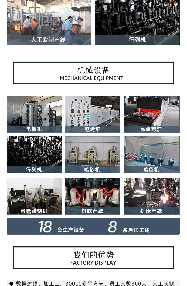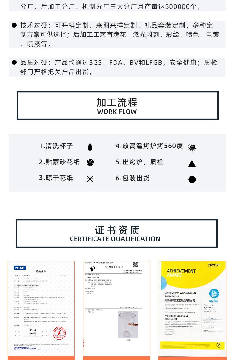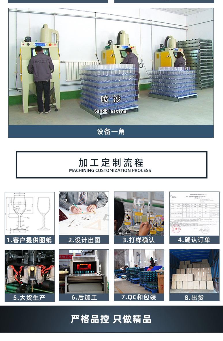 Os produtos da empresa incluem taças, copos de água, copos de licor, copos de uísque, copos de cerveja, vasos, pratos de frutas, chaleiras, castiçais, decantadores e outros produtos artificiais e mecânicos, bem como diversos pós-processamento, como panificação, pintura, galvanoplastia, jato de areia, gravação, etc. Os produtos passaram nos testes SGS, FDA, BV e LFGB e podem garantir totalmente segurança e praticidade no uso. A fábrica passou na inspeção de fábrica SEDEX e foi reconhecida pela maioria dos clientes europeus. A inspeção da fábrica segue padrões rígidos de direitos humanos, bem-estar dos funcionários e processos de qualidade de produção. Os bons resultados da inspeção de fábrica de nossa empresa confirmam, sem dúvida, a posição da Ruixin como uma empresa de alta qualidade em toda a indústria de processamento profundo de vidro.