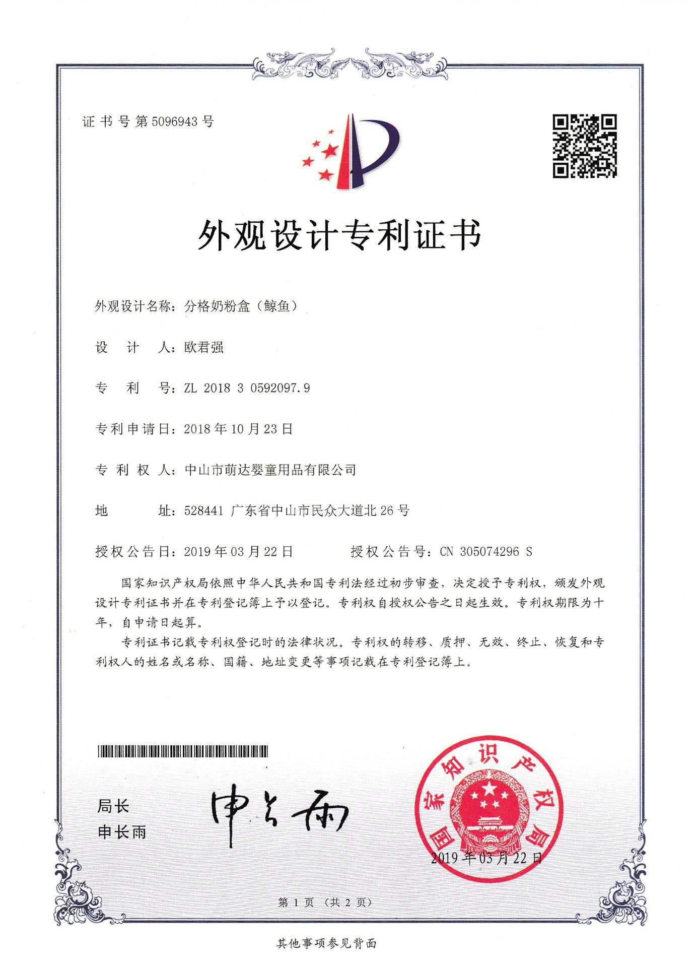 Número de patente para a aparência da caixa compartimentada para leite em pó (baleia): ZL201830592097.9