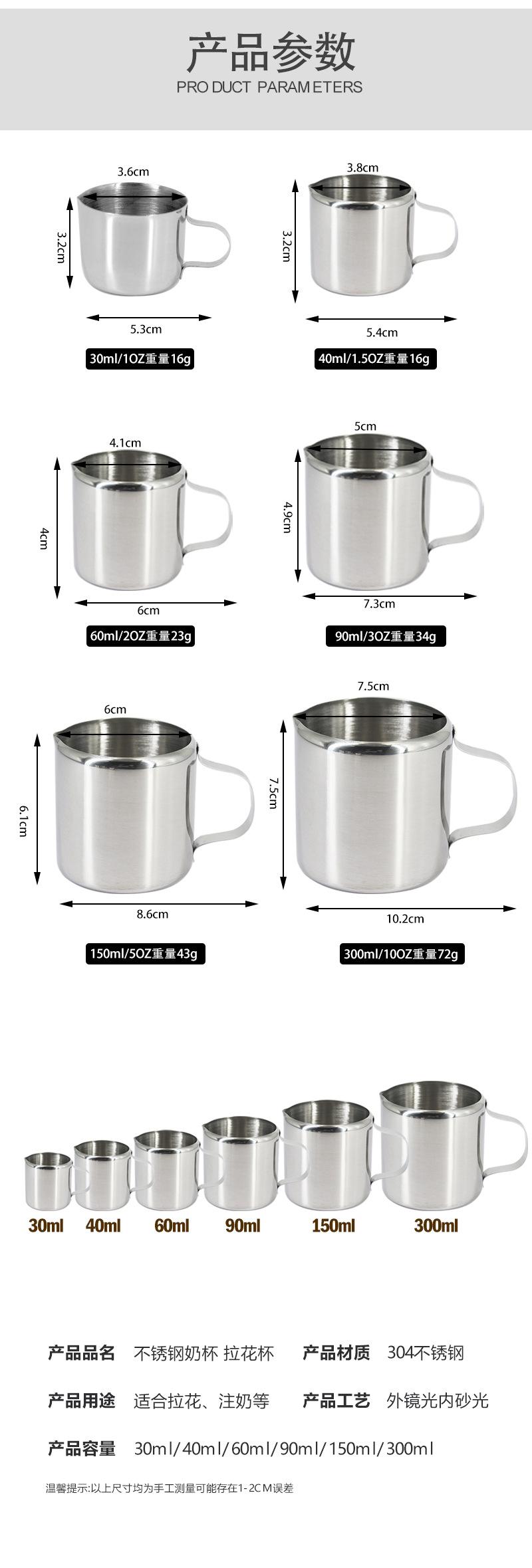 40ML: C5,4 (incluindo alça)*L3,8*A3,2cm Boca do copo incluindo comprimento da boca 3,8cm