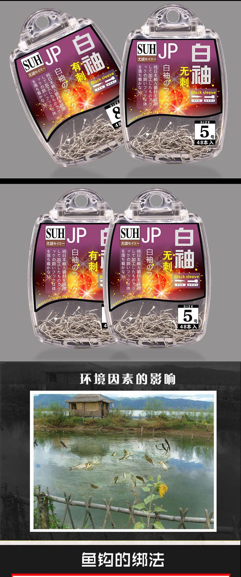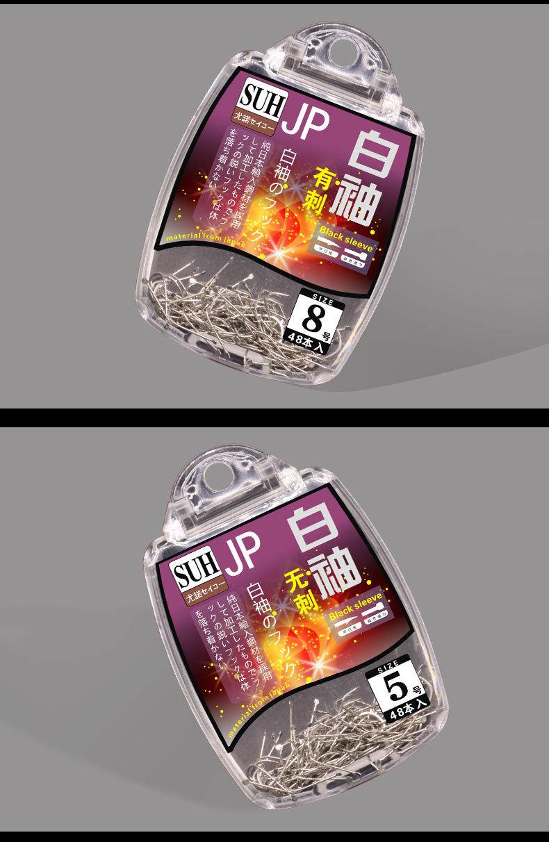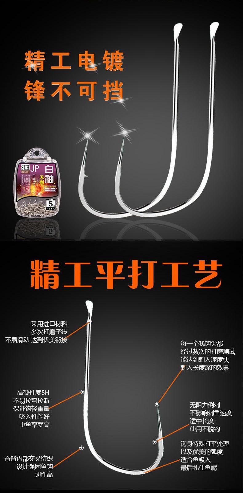 Manga: Este tipo de anzol não possui farpas. A ponta do gancho é afiada, o cabo do gancho é longo, o gancho é fino e o corpo do gancho é leve. É adequado para pequenas espécies de peixes que se alimentam por sucção. É rápido de pegar e rápido de pegar. É usado principalmente para capturar carpa cruciana branca, isca branca pequena, etc.