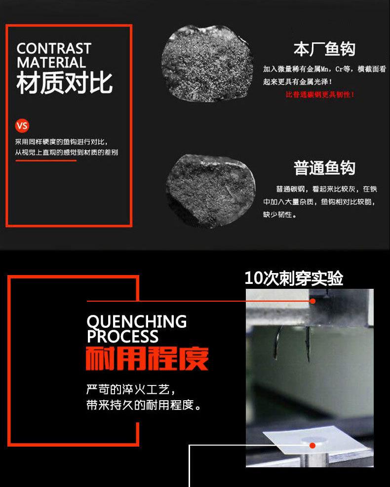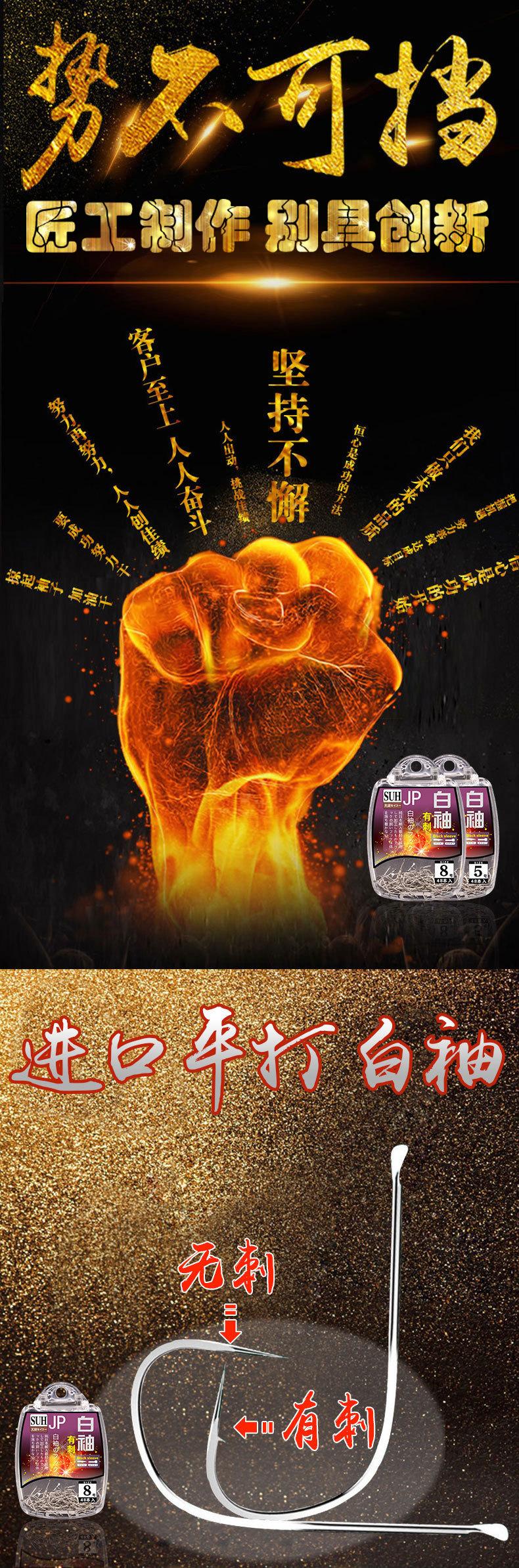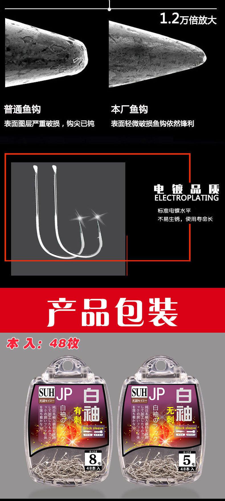 Manga: Este tipo de anzol não possui farpas. A ponta do gancho é afiada, o cabo do gancho é longo, o gancho é fino e o corpo do gancho é leve. É adequado para pequenas espécies de peixes que se alimentam por sucção. É rápido de pegar e rápido de pegar. É usado principalmente para capturar carpa cruciana branca, isca branca pequena, etc.