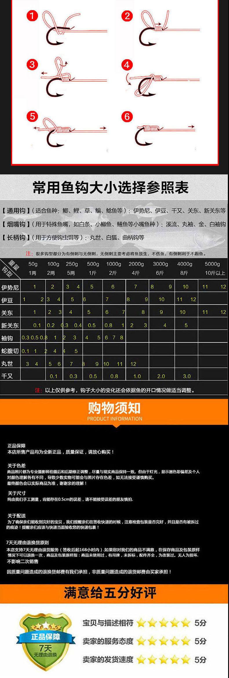 Quanto maior o anzol, maior será o círculo e mais largo será o anzol. Depois que o peixe é fisgado, a parte de trás do anzol desempenha o papel principal na força de sustentação. A diferença no formato do anzol se reflete principalmente na parte de trás do anzol, o que é digno de nota. O comprimento da extremidade do gancho significa a profundidade do gancho depois de ser enganchado. Se for longo, penetrará profundamente na carne, mas não será fácil de fisgar; se for curto, é fácil de enganchar, mas também fácil de desenganchar. A ponta do anzol precisa ser afiada, mas se for muito afiada, será facilmente fisgada ao tocar em plantas aquáticas e será difícil enfiar minhocas. A farpa precisa estar clara. Se for muito longo, será difícil retirar o anzol e, se for muito curto, a farpa perderá sua função.