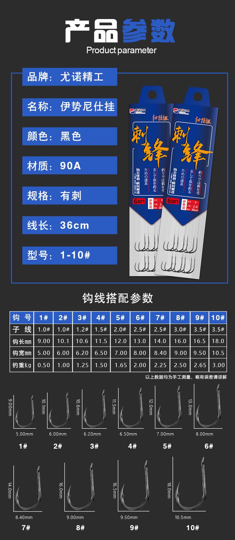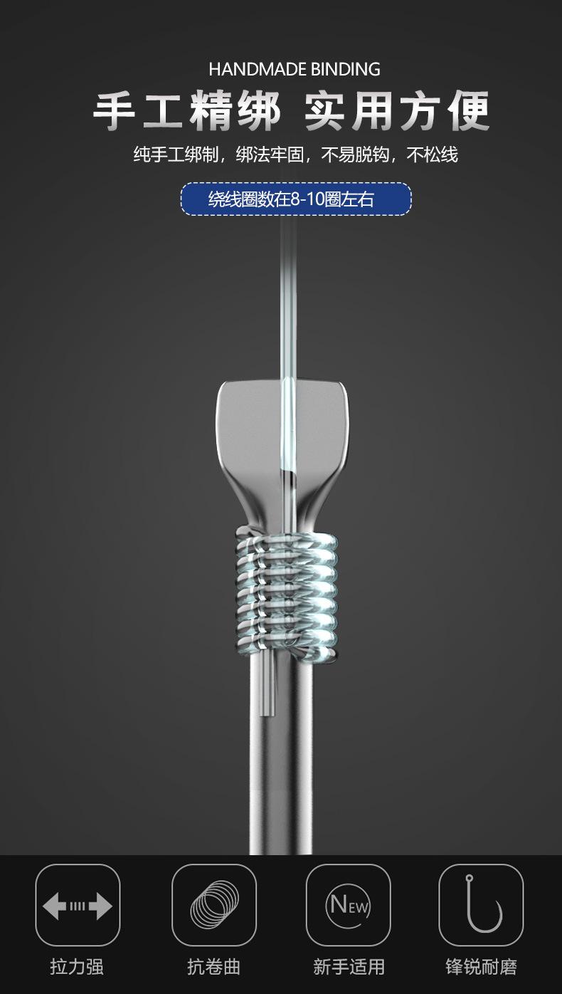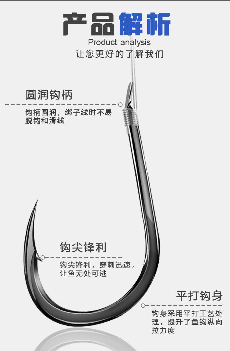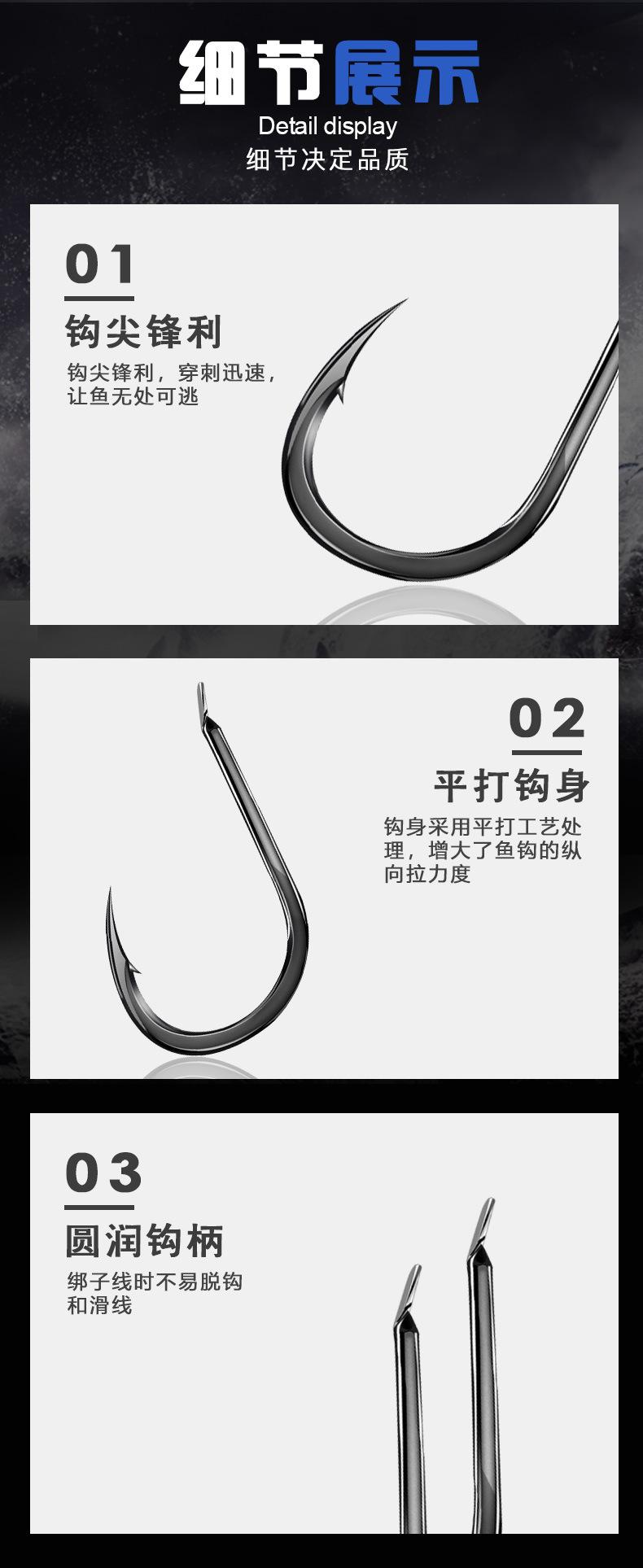 Manga: Este tipo de anzol não possui farpas. A ponta do gancho é afiada, o cabo do gancho é longo, o gancho é fino e o corpo do gancho é leve. É adequado para pequenas espécies de peixes que se alimentam por sucção. É rápido de pegar e rápido de pegar. É usado principalmente para capturar carpa cruciana branca, isca branca pequena, etc.