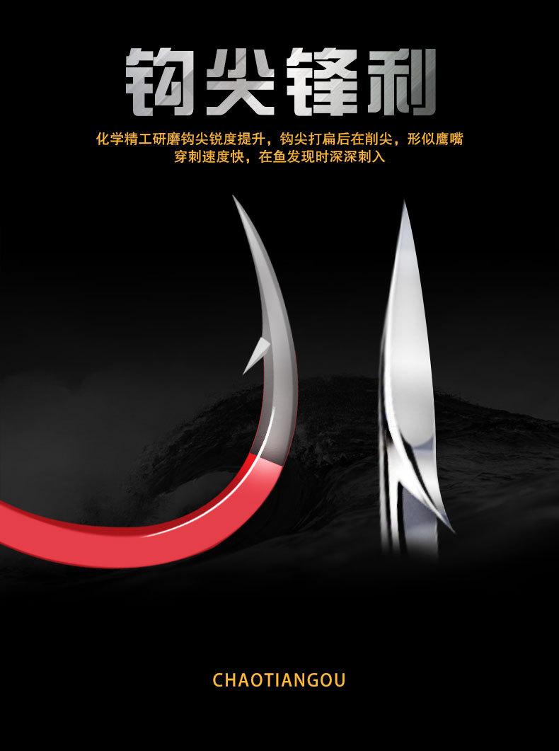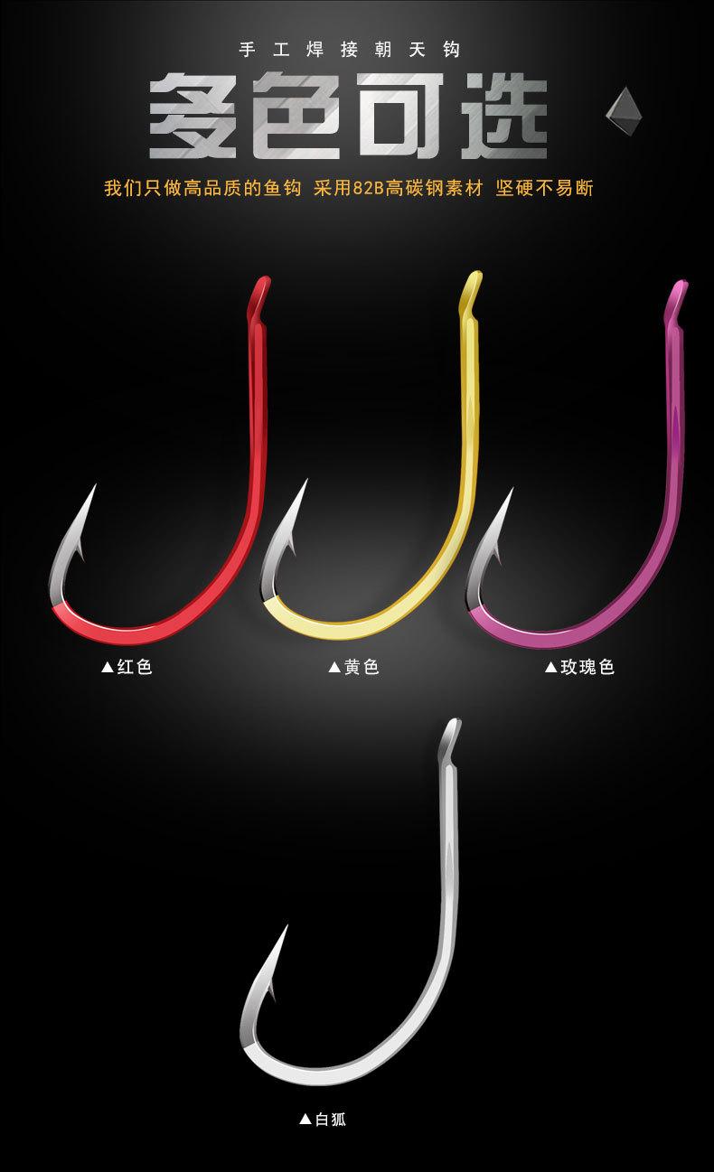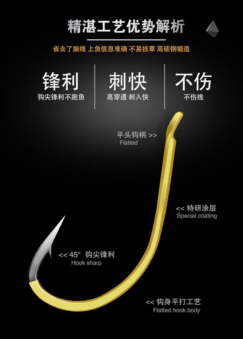 Manga: Este tipo de anzol não possui farpas. A ponta do gancho é afiada, o cabo do gancho é longo, o gancho é fino e o corpo do gancho é leve. É adequado para pequenas espécies de peixes que se alimentam por sucção. É rápido de pegar e rápido de pegar. É usado principalmente para capturar carpa cruciana branca, isca branca pequena, etc.
