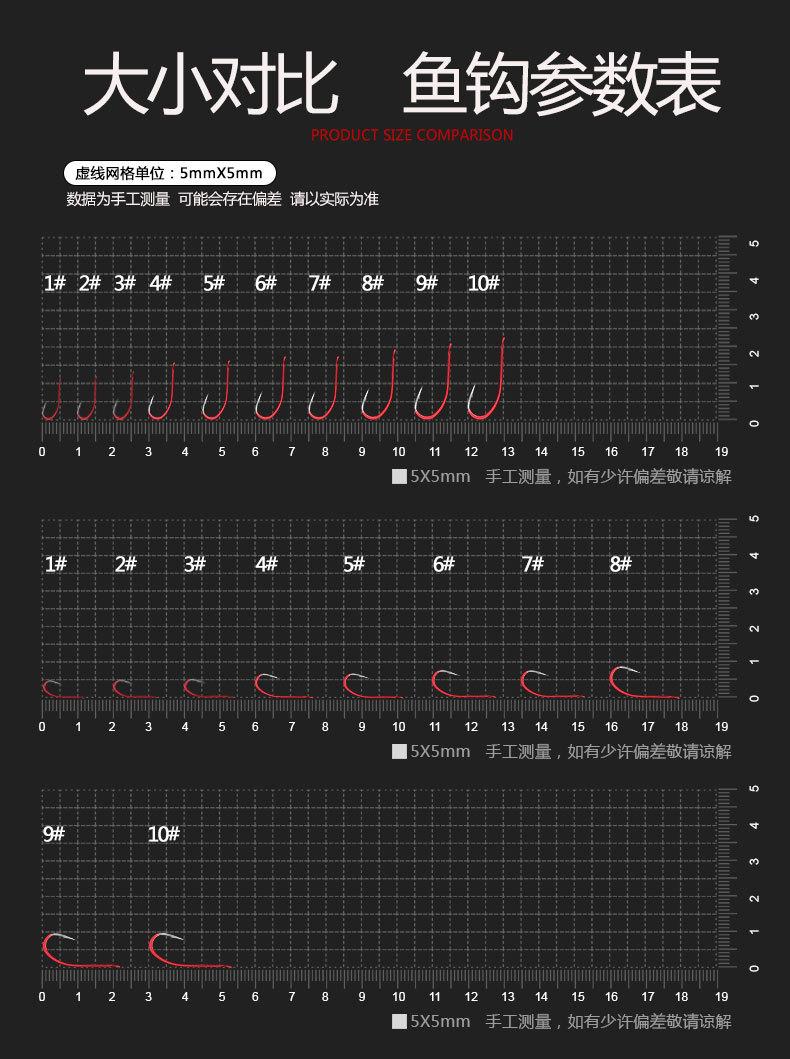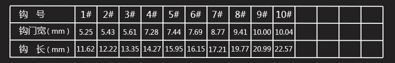 Quanto maior o anzol, maior será o círculo e mais largo será o anzol. Depois que o peixe é fisgado, a parte de trás do anzol desempenha o papel principal na força de sustentação. A diferença no formato do anzol se reflete principalmente na parte de trás do anzol, o que é digno de nota. O comprimento da extremidade do gancho significa a profundidade do gancho depois de ser enganchado. Se for longo, penetrará profundamente na carne, mas não será fácil de fisgar; se for curto, é fácil de enganchar, mas também fácil de desenganchar. A ponta do anzol precisa ser afiada, mas se for muito afiada, será facilmente fisgada ao tocar em plantas aquáticas e será difícil enfiar minhocas. A farpa precisa estar clara. Se for muito longo, será difícil retirar o anzol e, se for muito curto, a farpa perderá sua função.