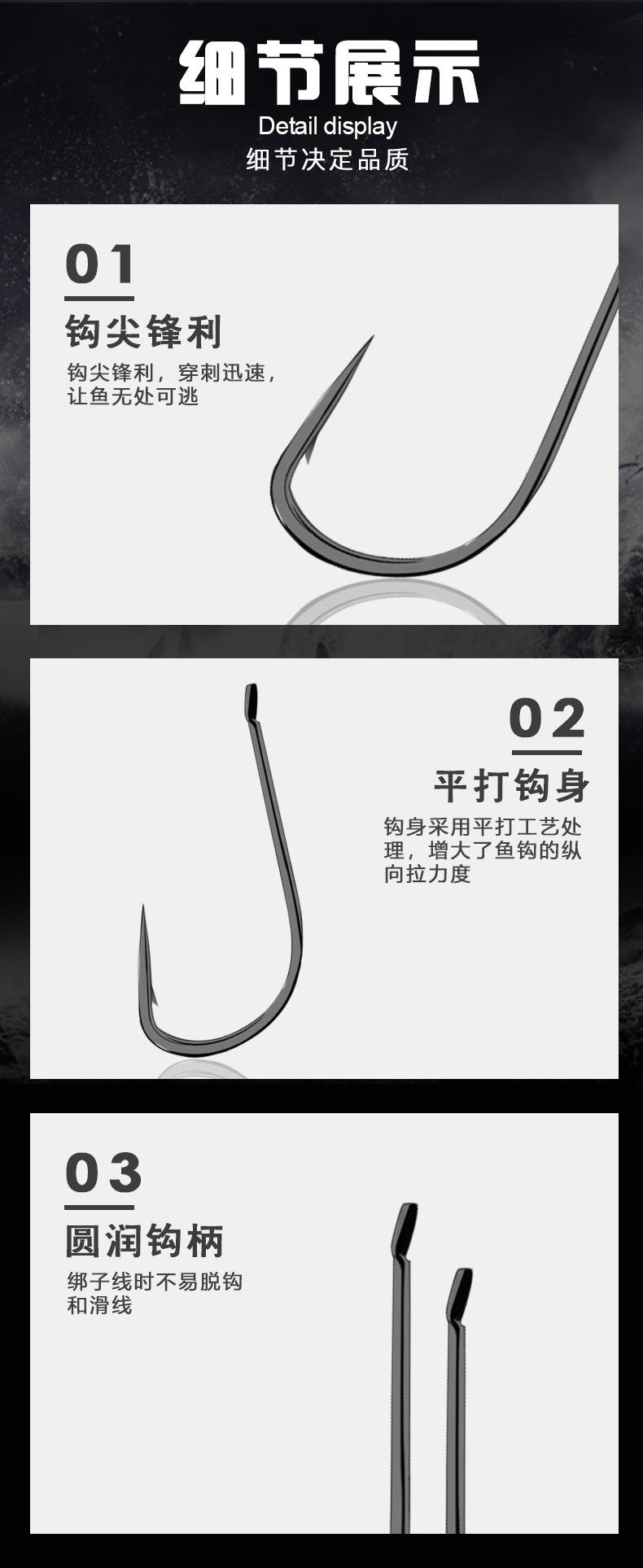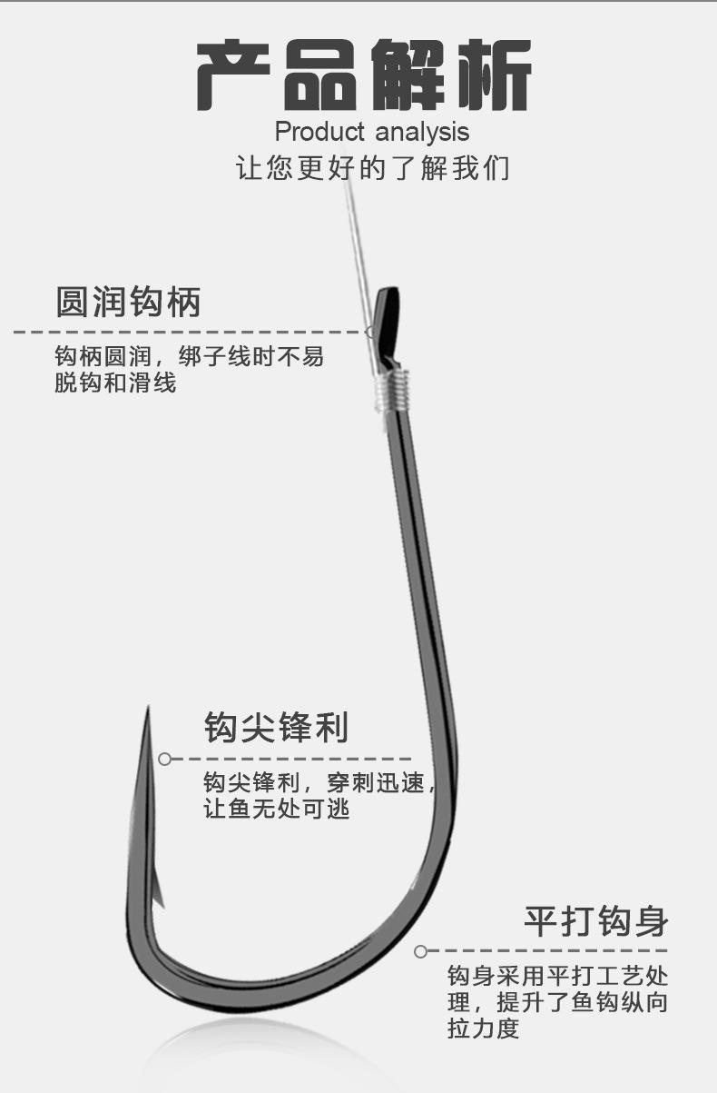 Manga: Este tipo de anzol não possui farpas. A ponta do gancho é afiada, o cabo do gancho é longo, o gancho é fino e o corpo do gancho é leve. É adequado para pequenas espécies de peixes que se alimentam por sucção. É rápido de pegar e rápido de pegar. É usado principalmente para capturar carpa cruciana branca, isca branca pequena, etc.