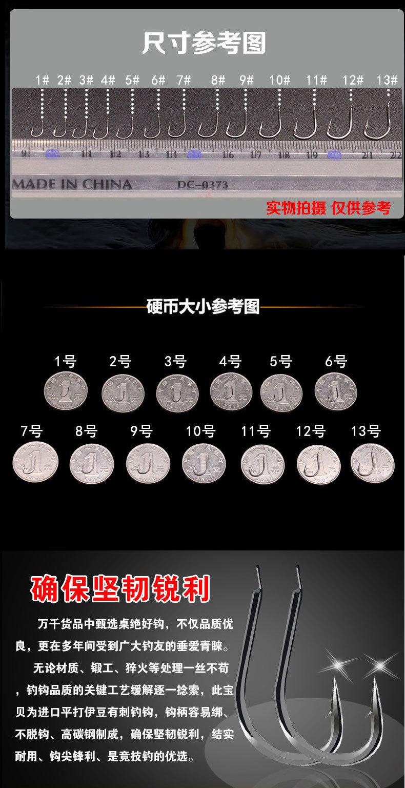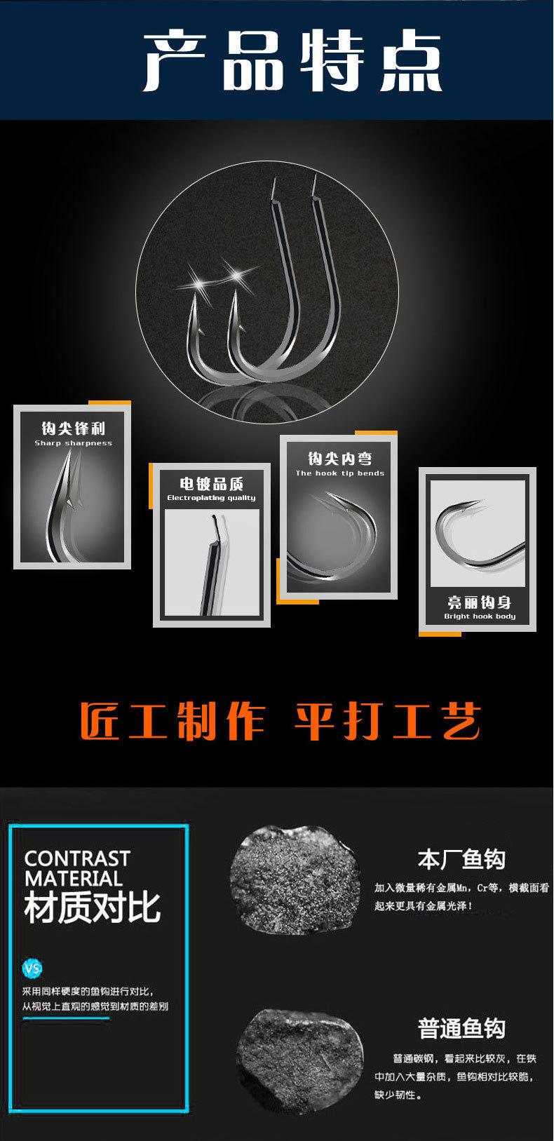 Manga: Este tipo de anzol não possui farpas. A ponta do gancho é afiada, o cabo do gancho é longo, o gancho é fino e o corpo do gancho é leve. É adequado para pequenas espécies de peixes que se alimentam por sucção. É rápido de pegar e rápido de pegar. É usado principalmente para capturar carpa cruciana branca, isca branca pequena, etc.