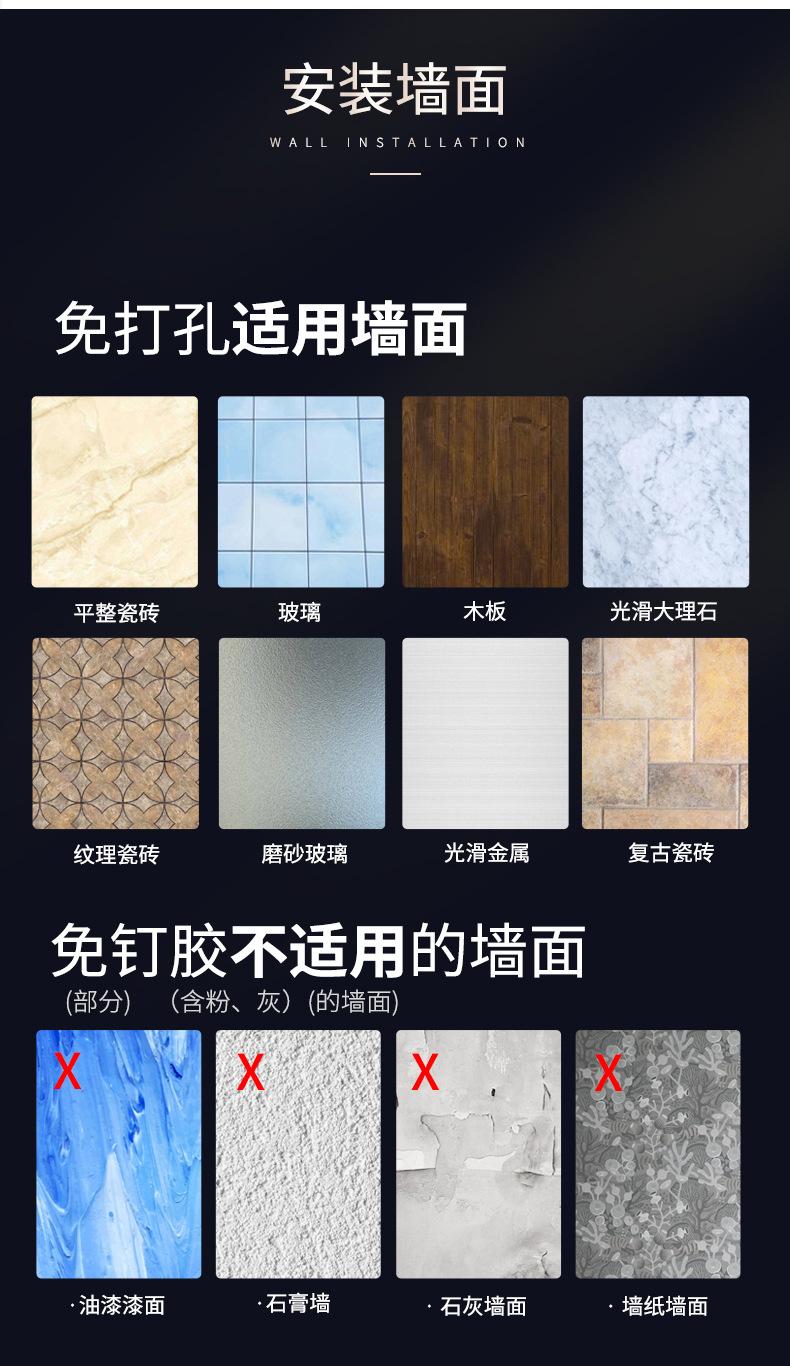(2) Para una instalación sin perforaciones, tenga en cuenta que la superficie de la pared debe ser plana y sólida, como baldosas de vidrio.No disponible enEn paredes irregulares e inestables como paredes pintadas, papel tapiz, paredes de cal, etc. Después de aplicar el pegamento en la pared, debe esperar de 3 a 5 días para que el pegamento sin clavos se seque completamente antes de usarlo.