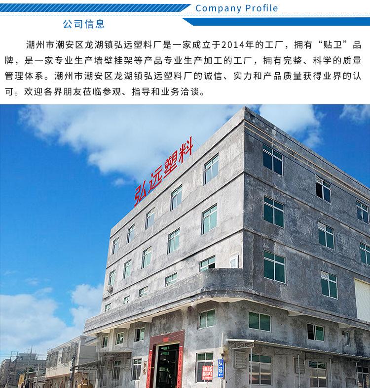 Historia de la marca: Longhu Hongyuan Plastic Factory, ubicada en el distrito de Chaoan, ciudad de Chaozhou, es un fabricante especializado en la producción de productos sin perforaciones. Desde su lanzamiento al mercado, sus productos han tenido una excelente aceptación entre los usuarios y su negocio ha continuado su desarrollo. Los productos sin perforaciones que fabricamos son diversos en forma y muy variados. Hemos construido una cadena de producción con una producción mensual de 5 millones de juegos de pegatinas sin clavos y ganchos sin marcas, brindando servicios de soporte a diversos fabricantes de productos para el baño y comercios en línea. Nuestros productos principales incluyen clavos, tornillos y ganchos sin marcas, cinta adhesiva de doble cara y otros accesorios sin perforaciones. También vendemos diversos accesorios para la producción de productos sin clavos, películas, piezas de plástico, herrajes, deshidratación, etc. Proporcionamos producción y procesamiento de diversos productos de plástico y servicios personalizados para productos especiales sin clavos.