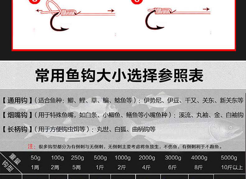 Quanto maior o anzol, maior será o círculo e mais largo será o anzol. Depois que o peixe é fisgado, a parte de trás do anzol desempenha o papel principal na força de sustentação. A diferença no formato do anzol se reflete principalmente na parte de trás do anzol, o que é digno de nota. O comprimento da extremidade do gancho significa a profundidade do gancho depois de ser enganchado. Se for longo, penetrará profundamente na carne, mas não será fácil de fisgar; se for curto, é fácil de enganchar, mas também fácil de desenganchar. A ponta do anzol precisa ser afiada, mas se for muito afiada, será facilmente fisgada ao tocar em plantas aquáticas e será difícil enfiar minhocas. A farpa precisa estar clara. Se for muito longo, será difícil retirar o anzol e, se for muito curto, a farpa perderá sua função.