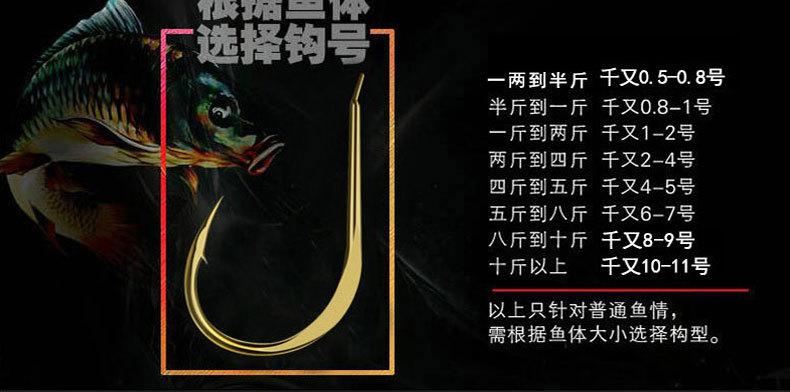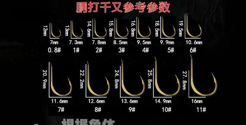 Ao pescar peixes grandes como carpa, carpa herbívora, carpa prateada e carpa cabeçuda em grandes corpos d’água como rios, viveiros de peixes e reservatórios, você deve escolher anzóis grandes como Senmata No. 12 e carpa preta doméstica nº 8, Changhai nº 921 e superior, com farpas distintas e uma distância não muito longa da ponta do anzol até a farpa. Se o alvo da pesca for peixes onívoros e ferozes como tilápia, pomfret prateado e redtail, deve-se escolher anzóis de cabo longo um pouco maiores, como Changhai nº 312-315, Marusei nº 13-19, riacho nº 9- 12 ou Ise No. 12-14 e anzóis grandes como Senmata No. 3 e superiores.