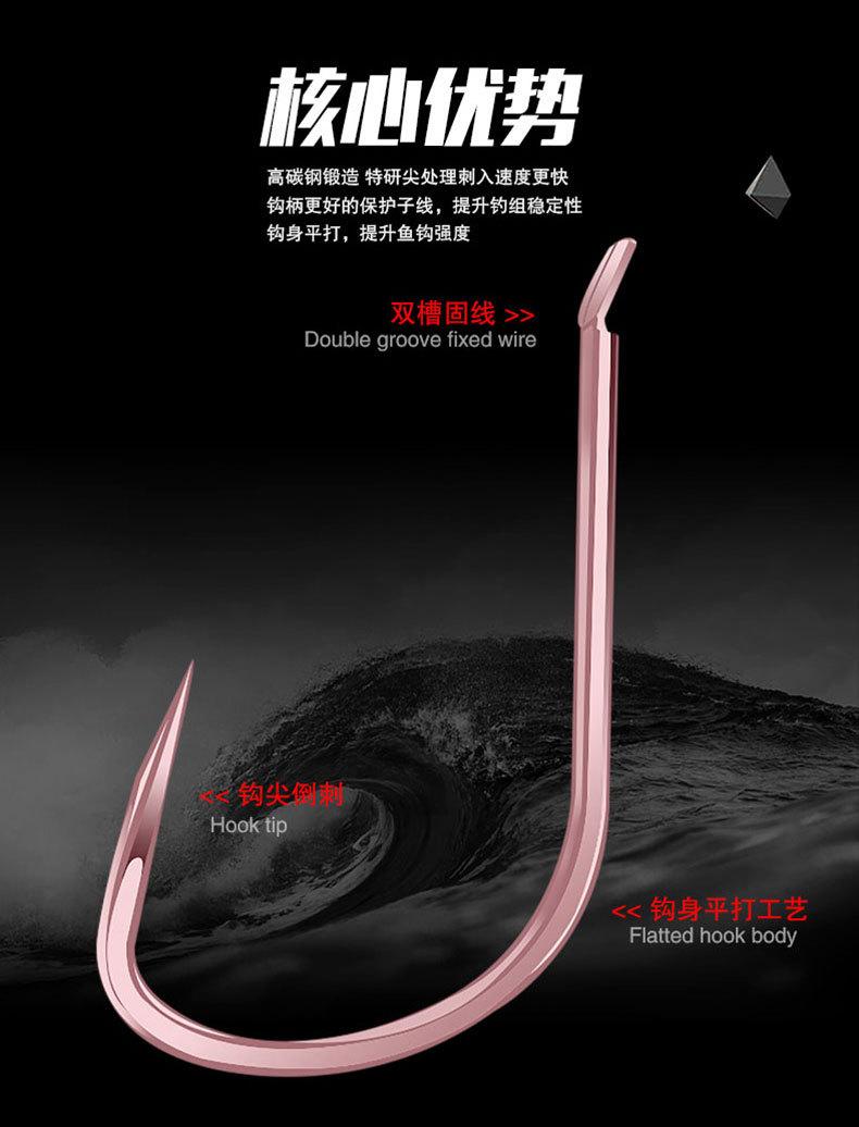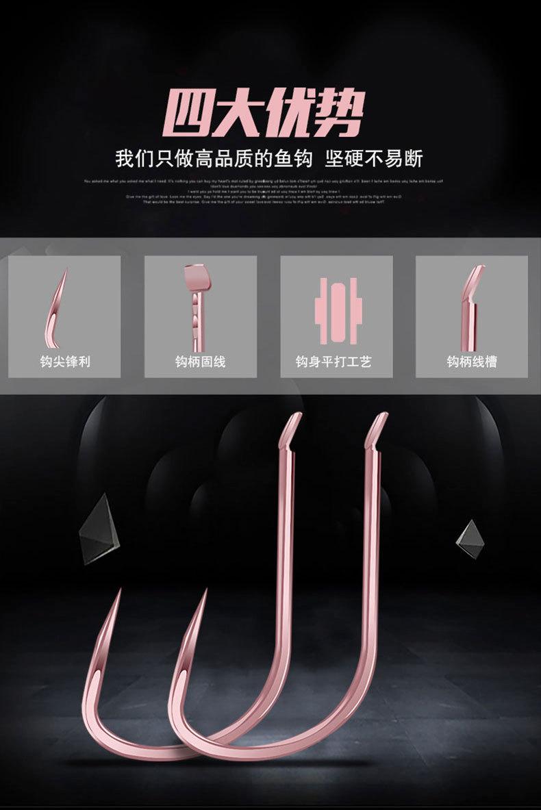 Manga: Este tipo de anzol não possui farpas. A ponta do gancho é afiada, o cabo do gancho é longo, o gancho é fino e o corpo do gancho é leve. É adequado para pequenas espécies de peixes que se alimentam por sucção. É rápido de pegar e rápido de pegar. É usado principalmente para capturar carpa cruciana branca, isca branca pequena, etc.
