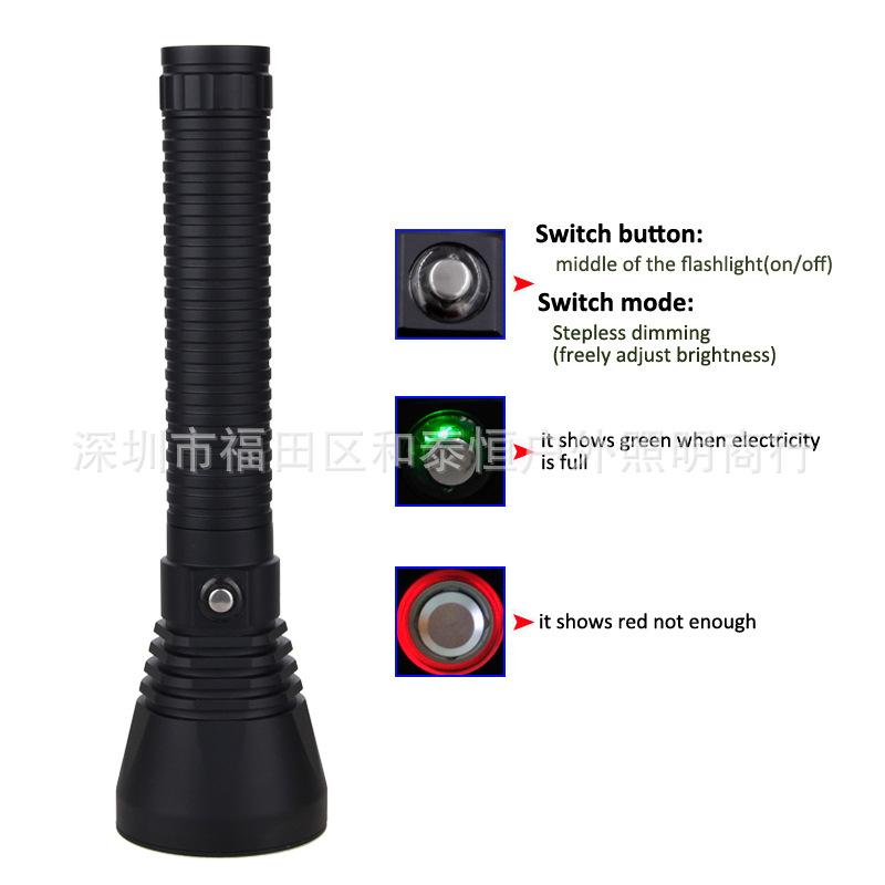 8.Fuente de alimentación en funcionamiento18650*2/26650*2Batería de litio. Las baterías de litio no se pueden descargar en exceso. Por favor, cárguelas a tiempo cuando la luz de la linterna se atenúe para evitar dañar la batería. (Para que la linterna funcione durante más tiempo, no se recomienda utilizar la función de luz fuerte durante mucho tiempo excepto para fines especiales. Ajuste las funciones fuerte y débil según las necesidades.)