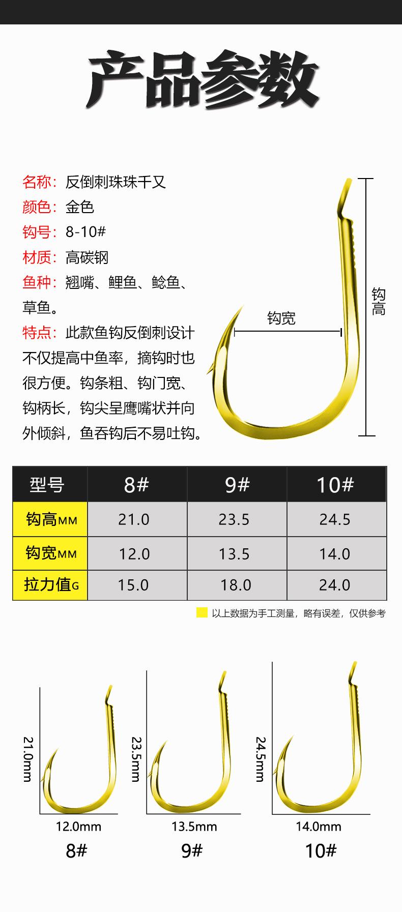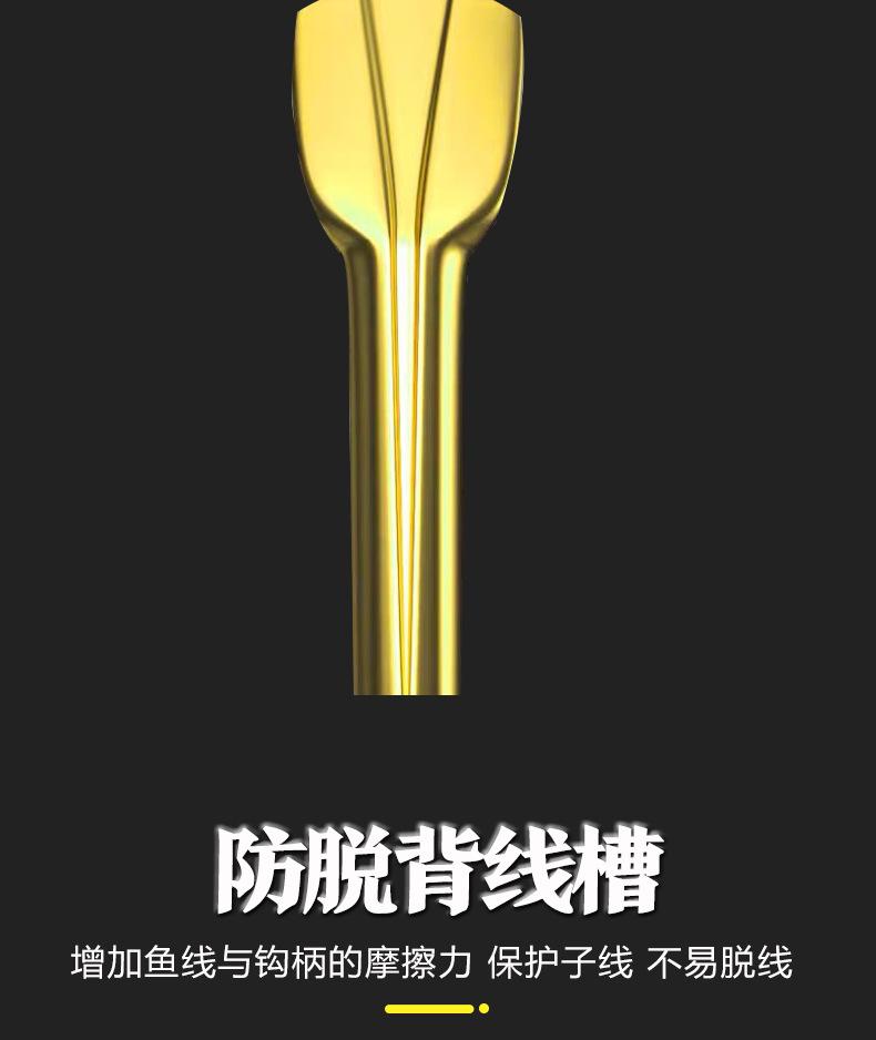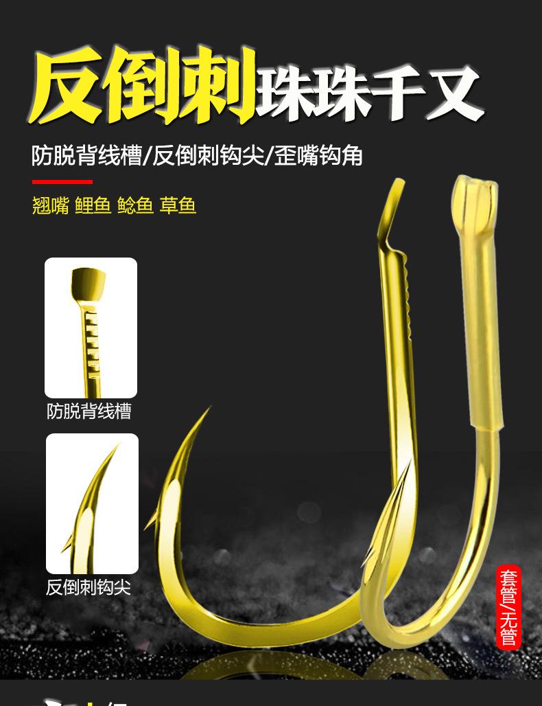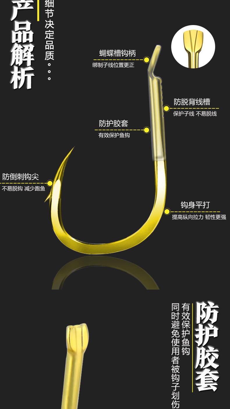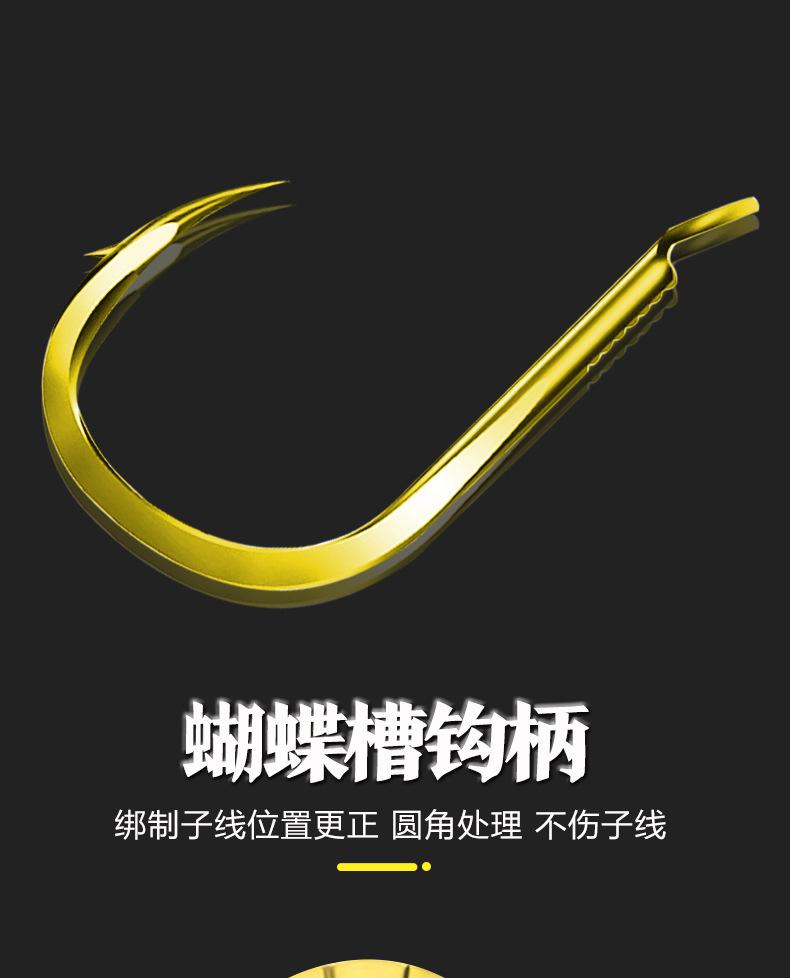 Manga: Este tipo de anzuelo no tiene púas. La punta es afilada, el mango es largo, el anzuelo es delgado y el cuerpo es ligero. Es adecuado para peces pequeños que se alimentan por succión. Es rápido de atrapar y de morder. Se utiliza principalmente para capturar carpas blancas, pequeños peces blancos, etc.