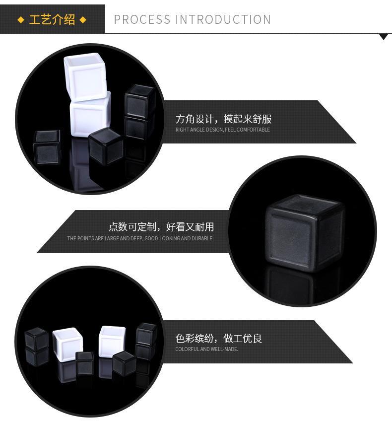 Nuestra fábrica se especializa en la fabricación de dados de alta gama de 8 mm a 100 mm con esquinas redondeadas, esquinas cuadradas y múltiples caras. Contamos con ingenieros de fabricación con más de diez años de experiencia en producción, tecnología de pulido de vanguardia y equipos de producción de última generación. Los dados de 8 mm a 25 mm se producen principalmente en plástico.