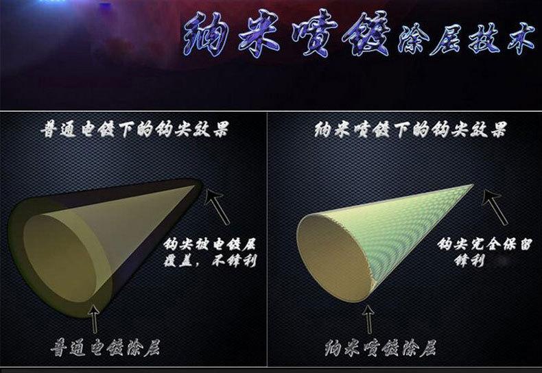 El propósito del pincho trasero es evitar que el pez se trague el anzuelo y no lo escupa. Se fabrica dividiendo la caña de pescar en ángulo en la parte inferior de la punta. Su proceso de fabricación es muy particular. Si la grieta es demasiado profunda, el ángulo de la púa será demasiado grande y deformado, y no funcionará bien; si la grieta es demasiado pequeña, el pincho trasero no será visible y no funcionará. Por lo tanto, la grieta debe ser moderada. Algunos anzuelos también tienen pinchos traseros, y se prefiere un ángulo de 30 grados.