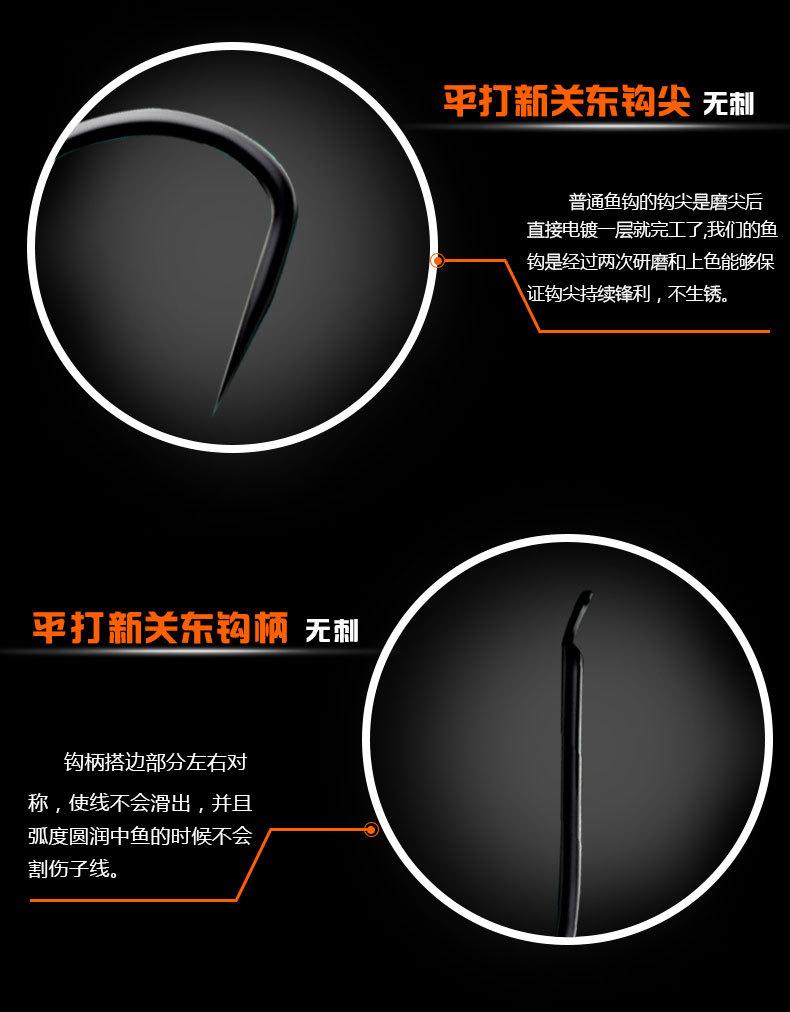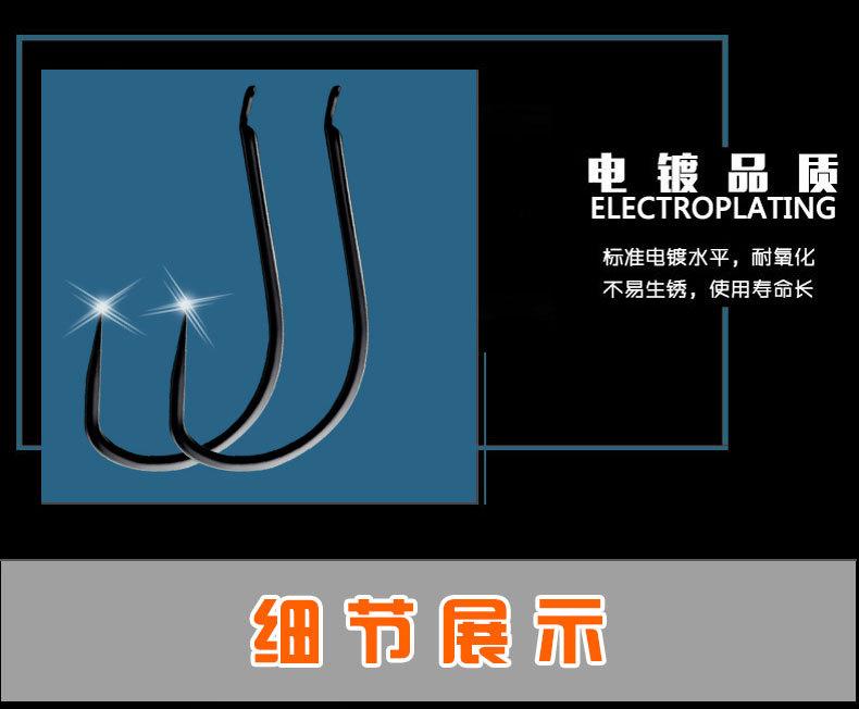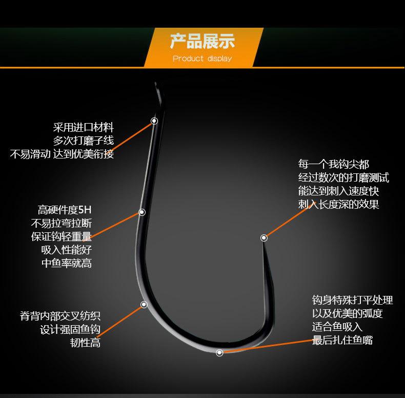 Manga: Este tipo de anzuelo no tiene púas. La punta es afilada, el mango es largo, el anzuelo es delgado y el cuerpo es ligero. Es adecuado para peces pequeños que se alimentan por succión. Es rápido de atrapar y de morder. Se utiliza principalmente para capturar carpas blancas, pequeños peces blancos, etc.