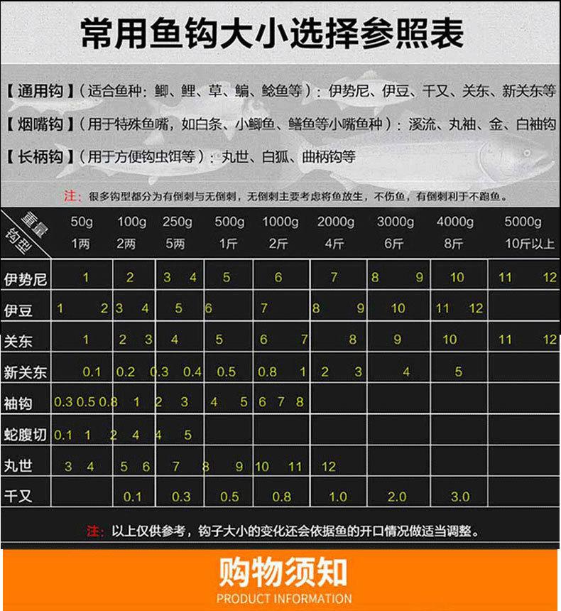Al pescar peces grandes como carpas, carpas herbívoras, carpas plateadas y carpas cabezonas en grandes masas de agua como ríos, estanques y embalses, debe elegir anzuelos grandes como Senmata No. 2, Ise No. 9, Marusei No. 12 y carpa negra doméstica No. 8, Changhai No. 921 y superiores, con púas distintivas y una distancia no demasiado larga desde la punta del anzuelo hasta la púa. Si el objetivo de la pesca son peces omnívoros y feroces como la tilapia, la palometa plateada y la cola roja, debe elegir anzuelos un poco más grandes con mango largo, como Changhai No. 312-315, Marusei No. 13-19, stream No. 9-12 o Ise No. 12-14 y anzuelos grandes como Senmata No. 3 y superiores.
