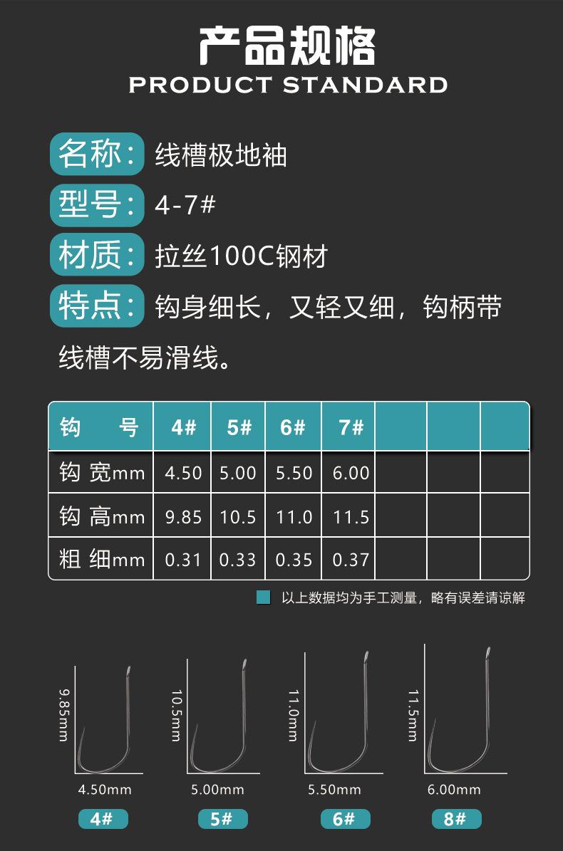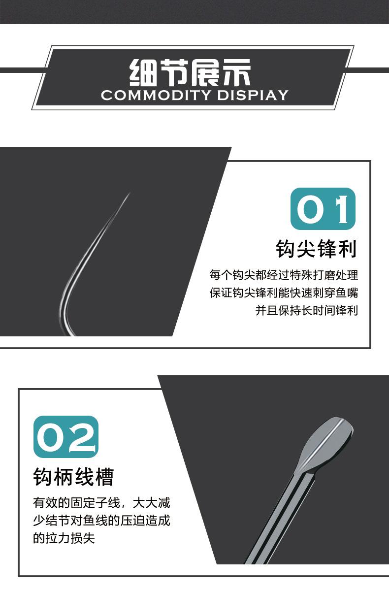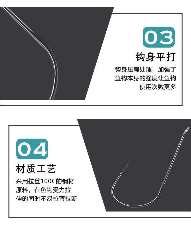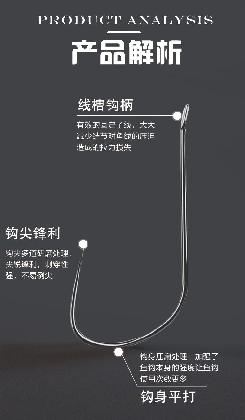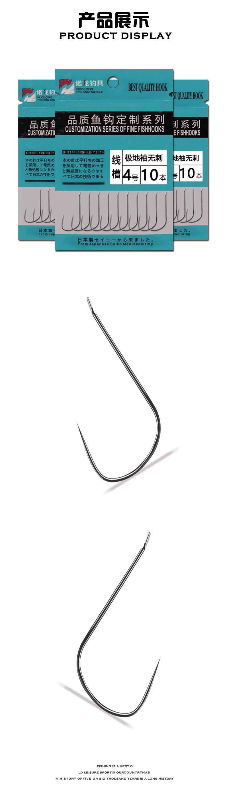 Manga: Este tipo de anzol não possui farpas. A ponta do gancho é afiada, o cabo do gancho é longo, o gancho é fino e o corpo do gancho é leve. É adequado para pequenas espécies de peixes que se alimentam por sucção. É rápido de pegar e rápido de pegar. É usado principalmente para capturar carpa cruciana branca, isca branca pequena, etc.