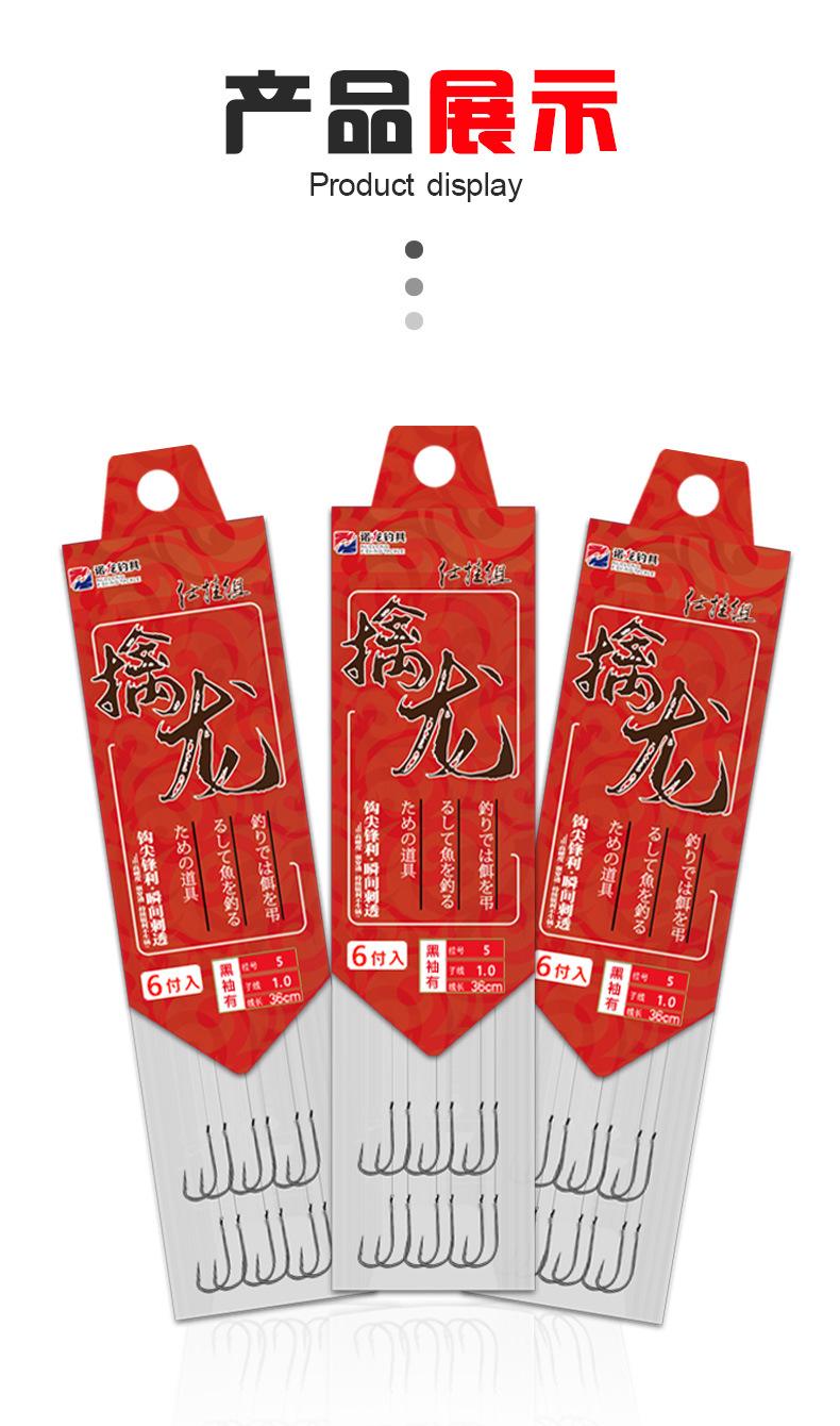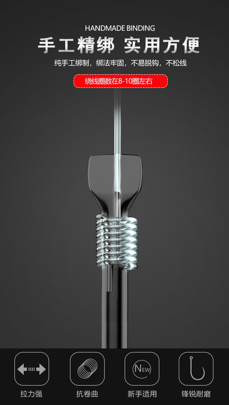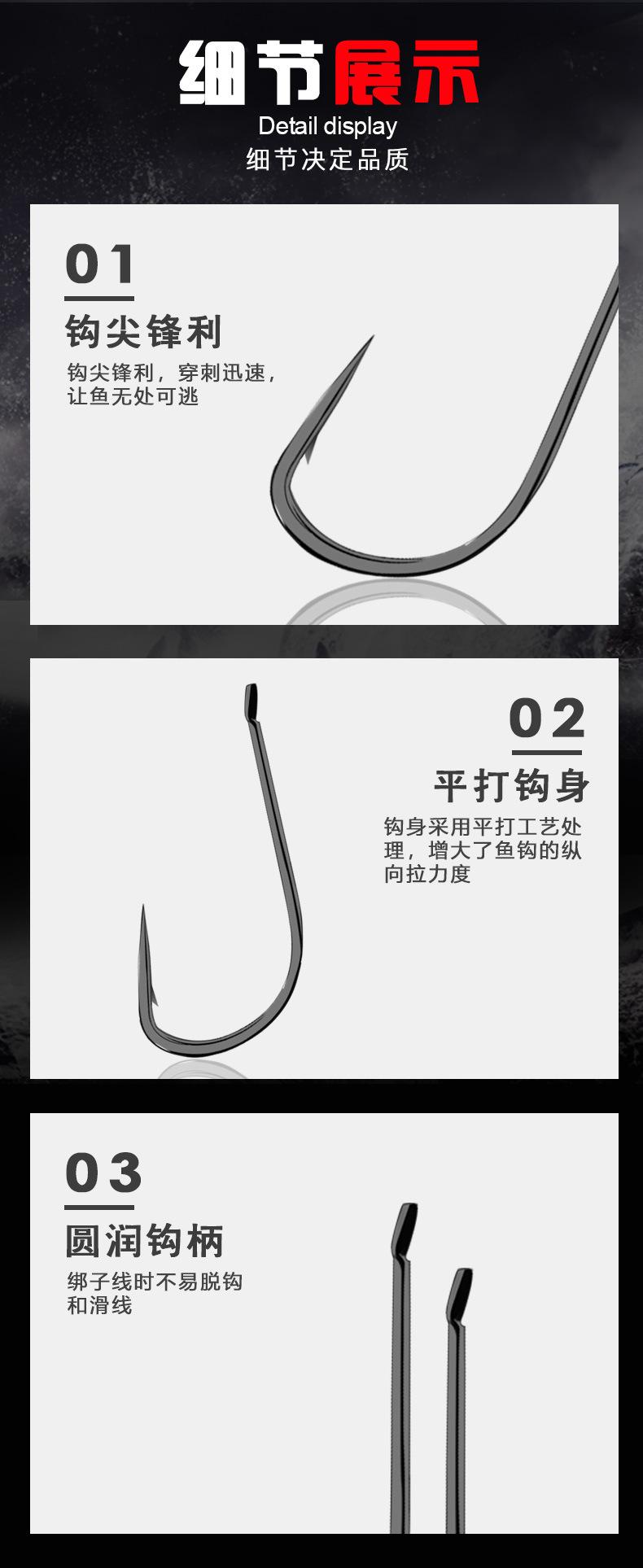Manga: Este tipo de anzol não possui farpas. A ponta do gancho é afiada, o cabo do gancho é longo, o gancho é fino e o corpo do gancho é leve. É adequado para pequenas espécies de peixes que se alimentam por sucção. É rápido de pegar e rápido de pegar. É usado principalmente para capturar carpa cruciana branca, isca branca pequena, etc.