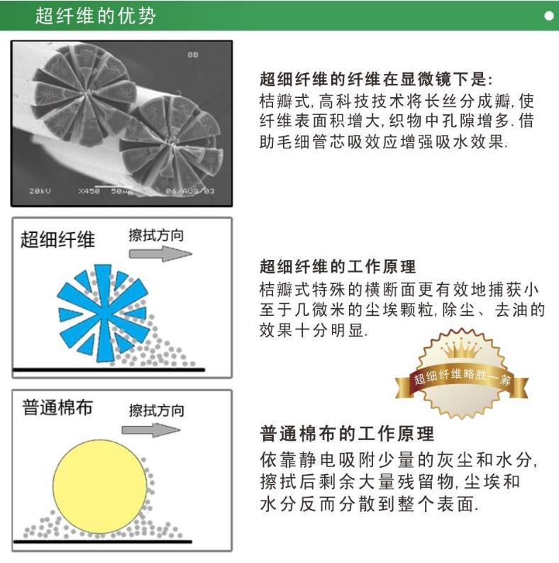 Forte poder de limpeza:A finura das microfibras com diâmetro de 0,4 μm é de apenas 1/10 da seda. Sua seção transversal especial pode capturar com mais eficácia partículas de poeira tão pequenas quanto alguns mícrons, e o efeito da descontaminação e remoção de óleo é muito óbvio.