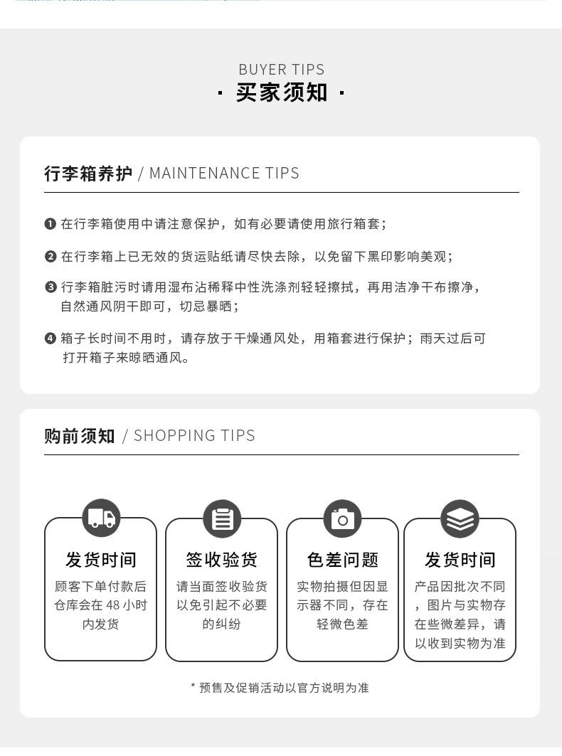 3. Sobre acessórios: Todas as caixas de 20 polegadas não têm alças laterais e pés laterais. Devido a diferentes lotes de produção, alguns estilos de acessórios podem ser diferentes (incluindo, mas não se limitando a: rodas, zíperes, estrutura interna, hastes de puxar, alças, travas, forro). Tenha cuidado ao comprar se você se importar, e tente perguntar claramente ao se comunicar!
