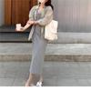Spice Girls Vestido de malha de manga curta Verão feminino Nova cintura plissada Emagrecimento Saia dividida de comprimento médio Saia longa francesa