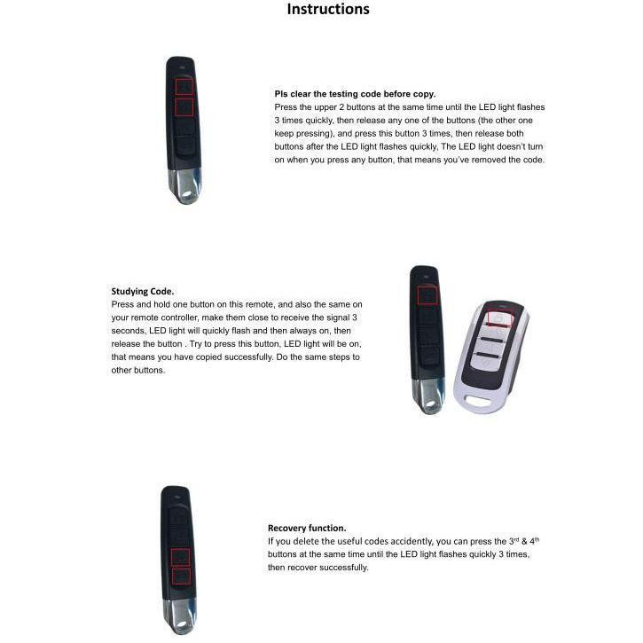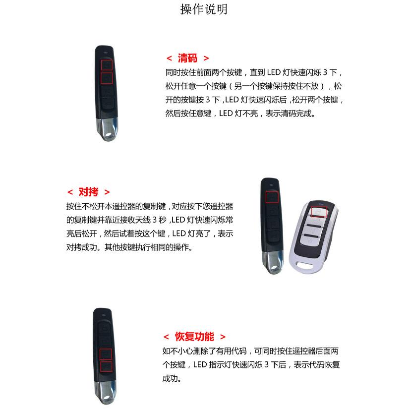 Uma mão segura o controle remoto original, enquanto a outra mantém o controle remoto cópia, os dois controles remotos devem ser colocados o mais próximo possível (a situação ideal é colocar os dois controles remotos na mesa lado a lado com distância zero), respectivamente pressione o botão de cópia, quando a luz indicadora LED piscar rapidamente após três flashes, esta cópia foi bem-sucedida, outros métodos operacionais principais são os mesmos. Alguns controles remotos têm uma potência de transmissão menor, portanto, o controle remoto original deve ser colocado de volta no controle remoto de cópia para ser operado. Na presença de ruído, deve-se evitar interferência na operação. Se a cópia não for bem-sucedida, deverá copiar novamente após limpar o código.