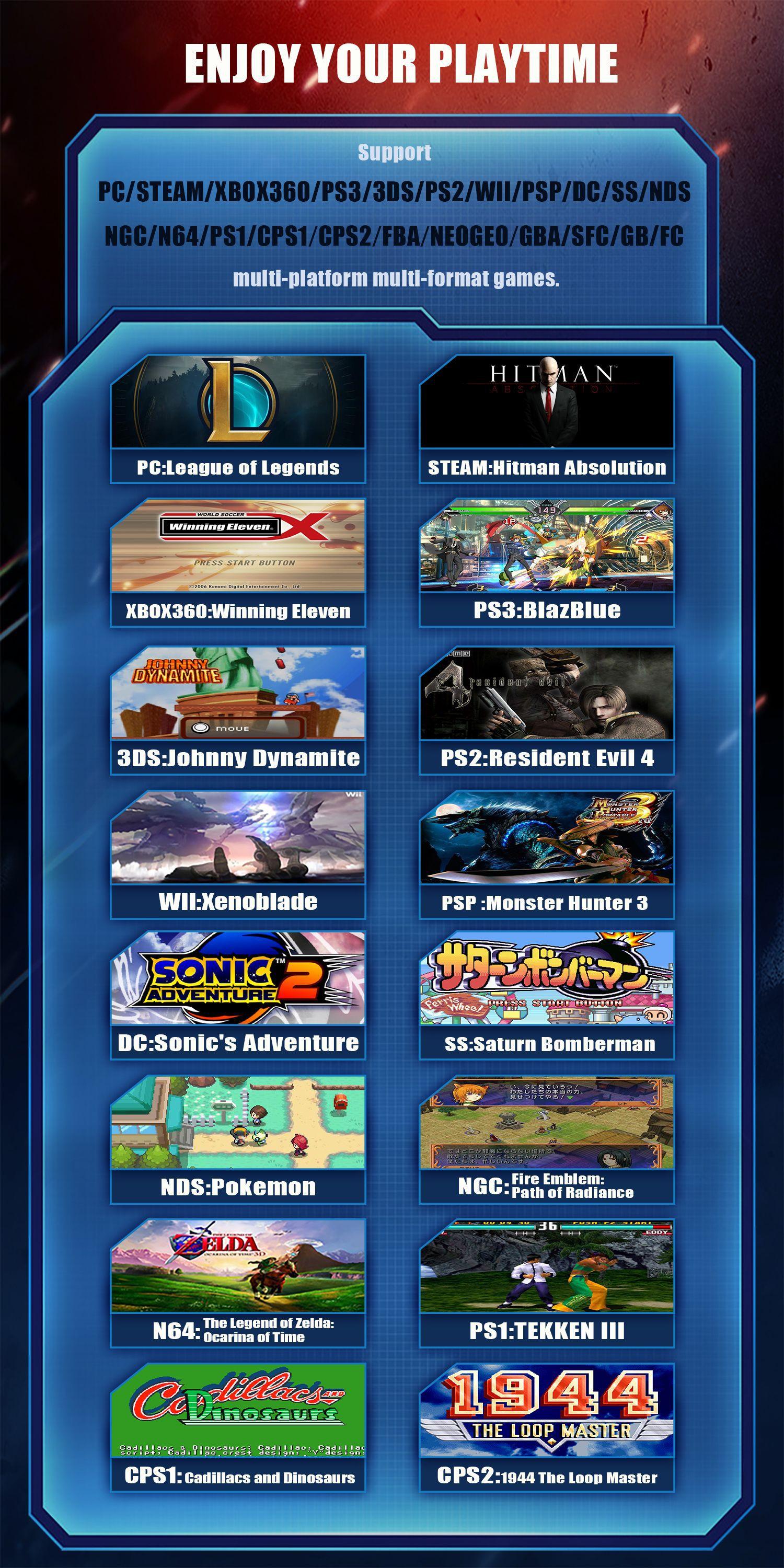 | jogo | Steam,PC,XBOX360,PS3,3DS,PS2,WII,PSP,DC,SS,NDS,NGC,N64,PS1,CPS1、CPS2、FB、NEOGEO、GBA,SFC,GB,FCJogos multiplataforma e multiformato Apoie os usuários no download de jogos em formatos relacionados,Suporta motor de vibração |