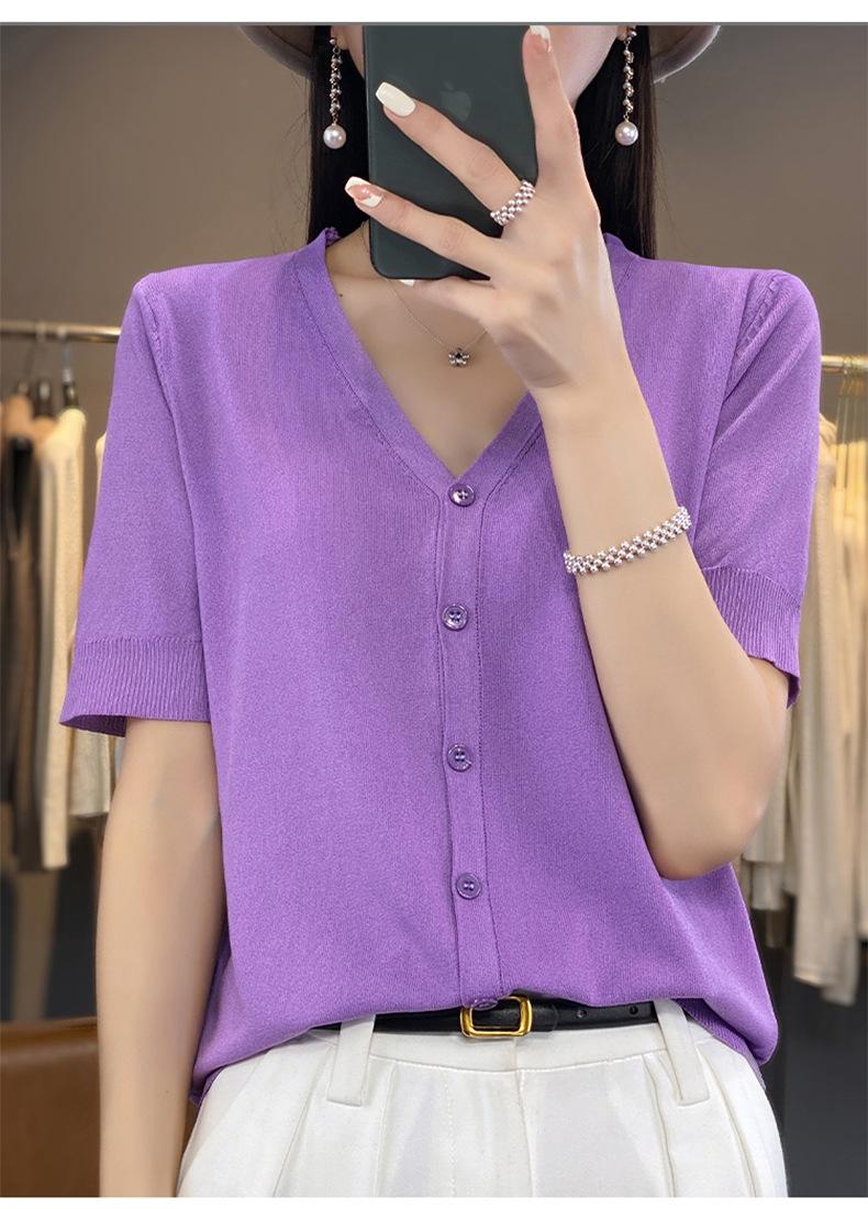 Ice silk V-neck tricotado cardigan manga curta feminino verão fino exterior T-shirt top 2023 Nova manga solta all-match