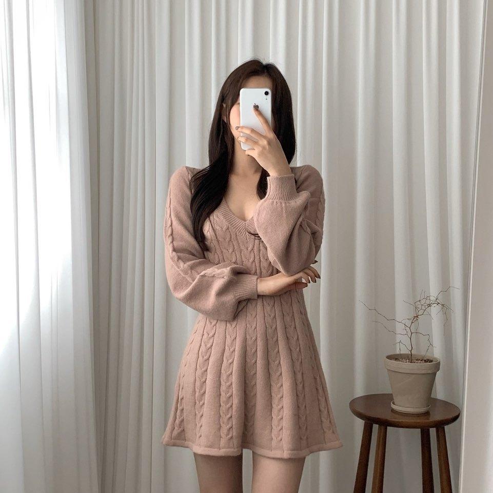 Compre Coreia do Sul chique outono e inverno vintage padrão de cânhamo com decote em V cintura apertada pequena manga lanterna A-line vestido de camisola de malha feminina no atacado no Joom.pro