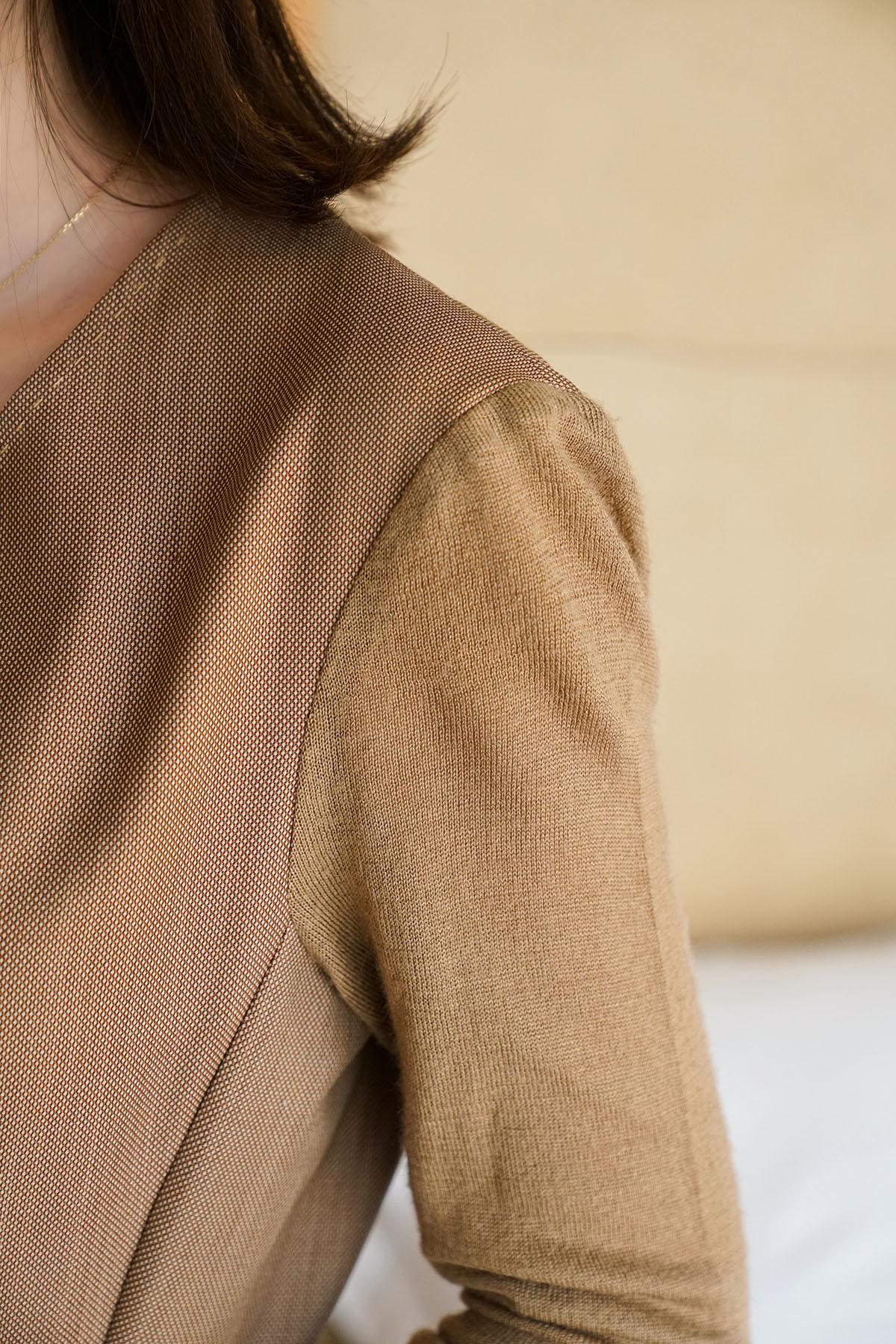 Suas mangas são confeccionadas em patchwork de malha de lã