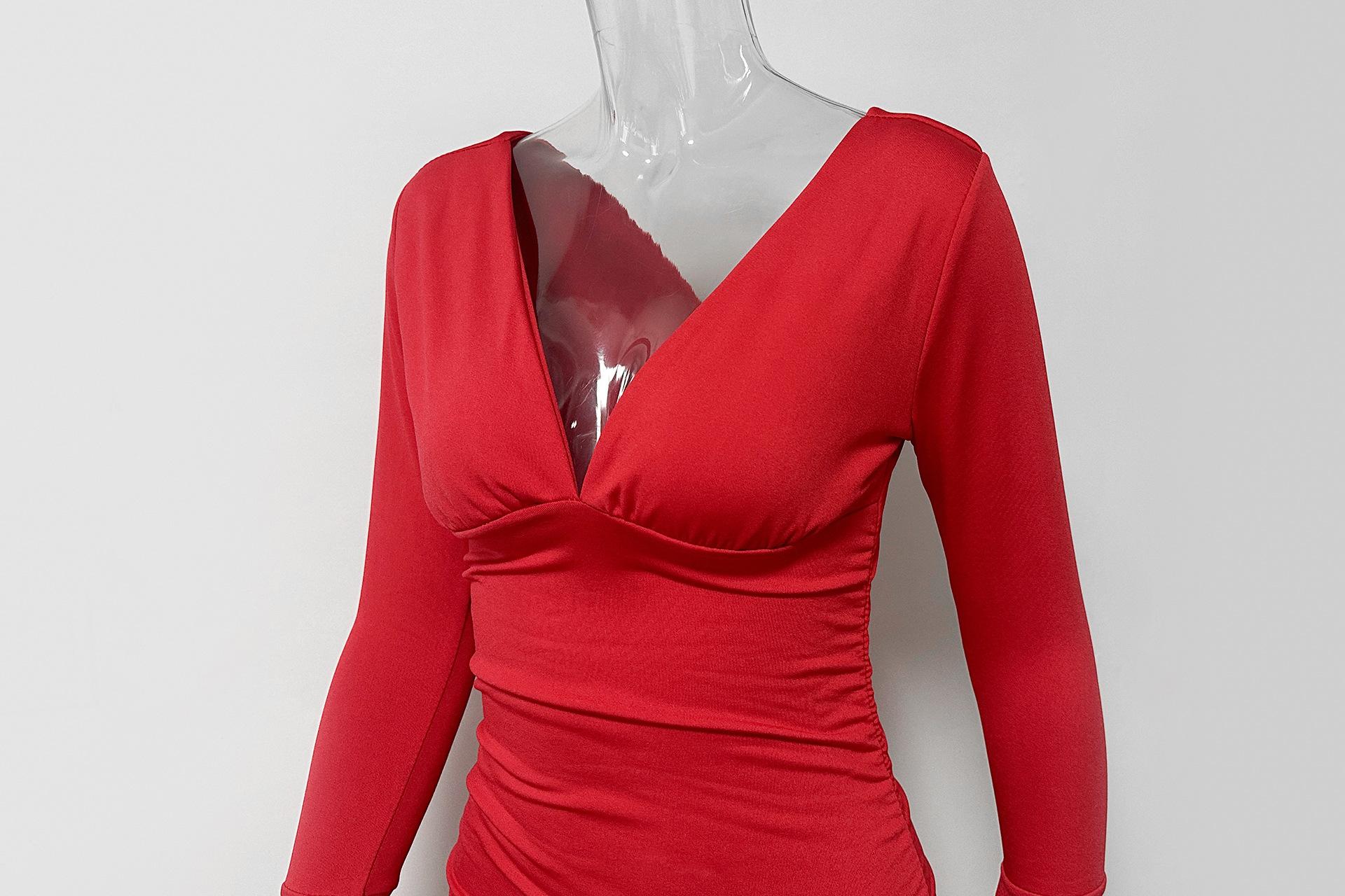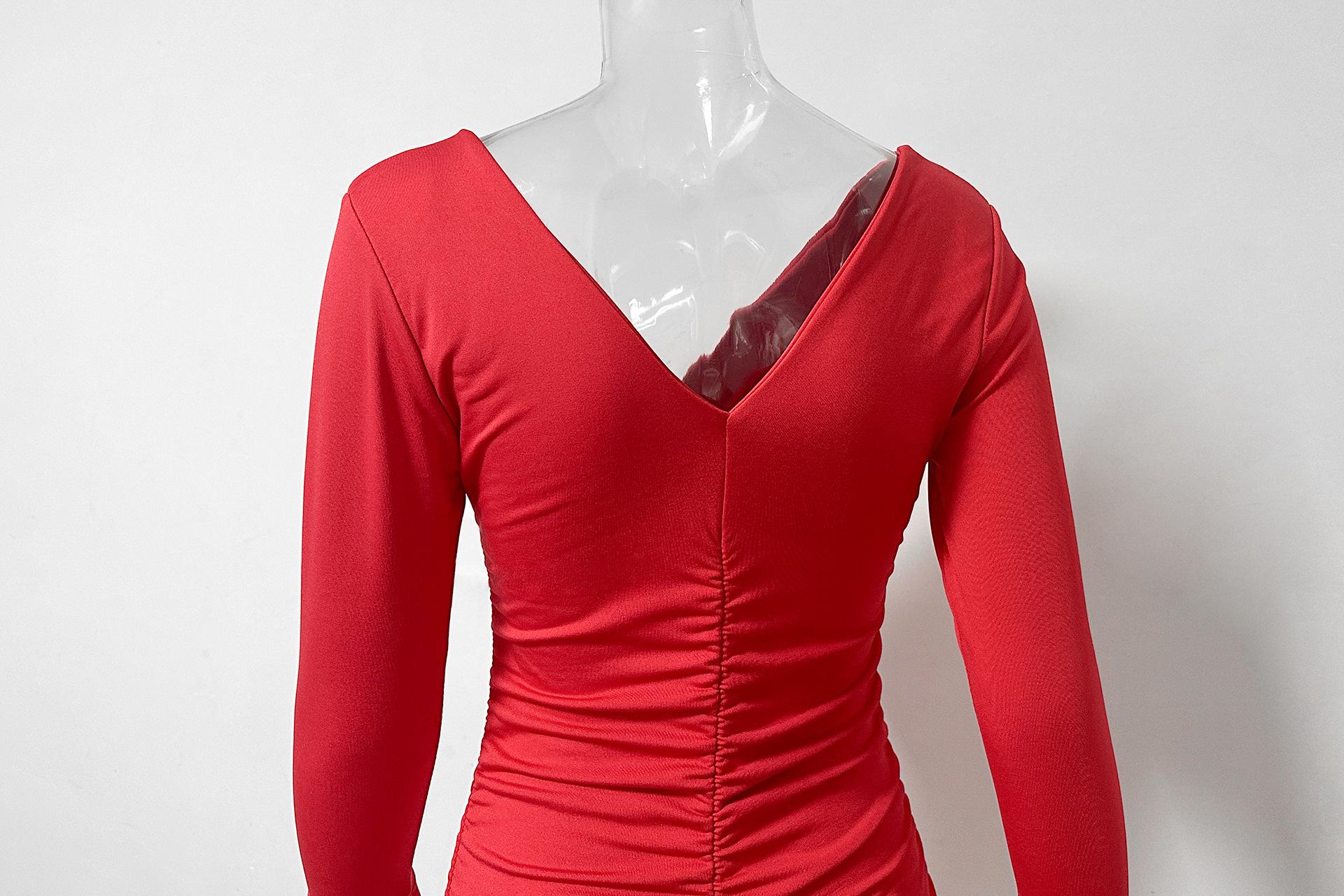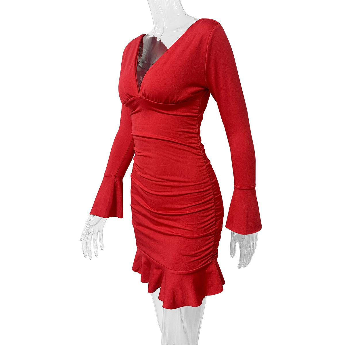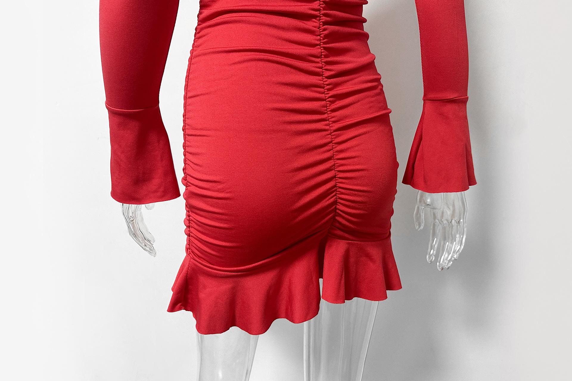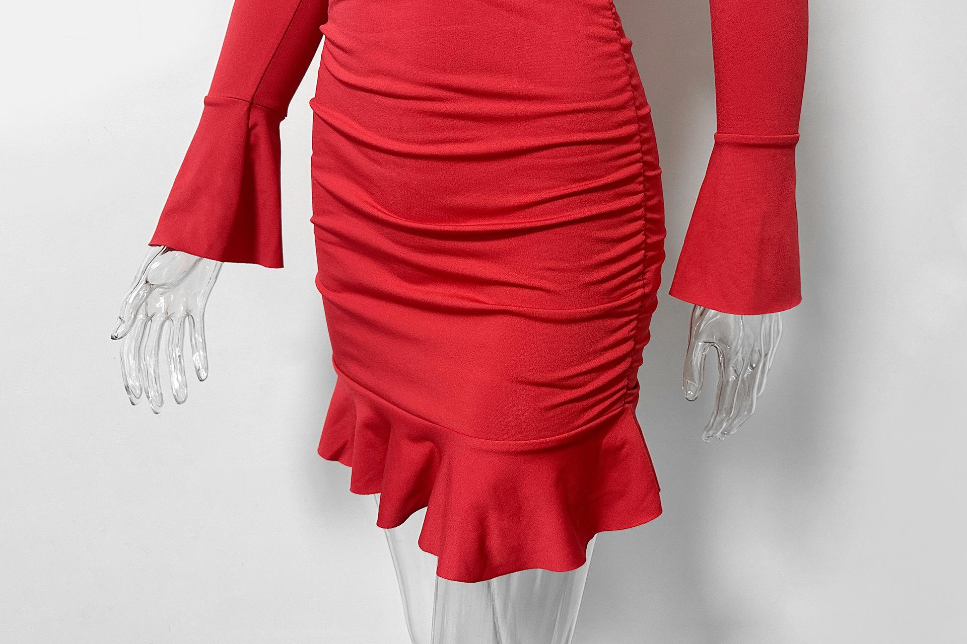 \Recorte profundo com decote em V, mangas trompete, design de saia com babados, moderno e elegante;