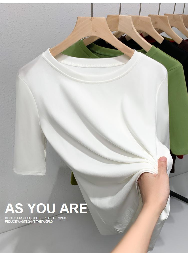 Camiseta de Manga Média para Mulheres Verão 2023 Novo Europeu Camiseta Básica Feminina de Algodão Cor Pura Gola Redonda Top Elegante de Manga Três Quartos
