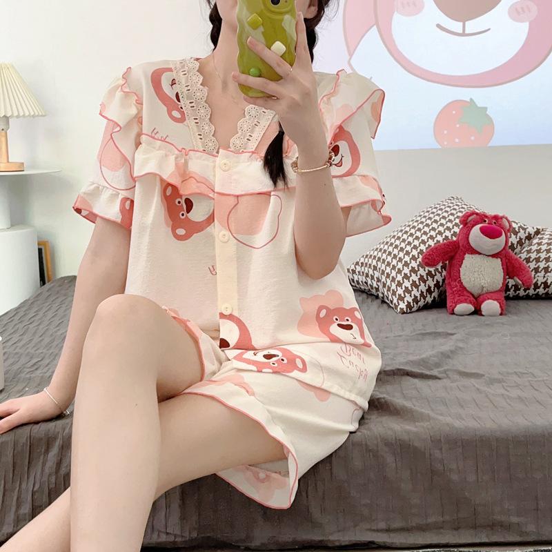 Compre Pijamas Verão Tecido Bolha de Algodão Enrugado Ins Princess Style Bonito manga curta Verão Thin Home Suit no atacado no Joom.pro