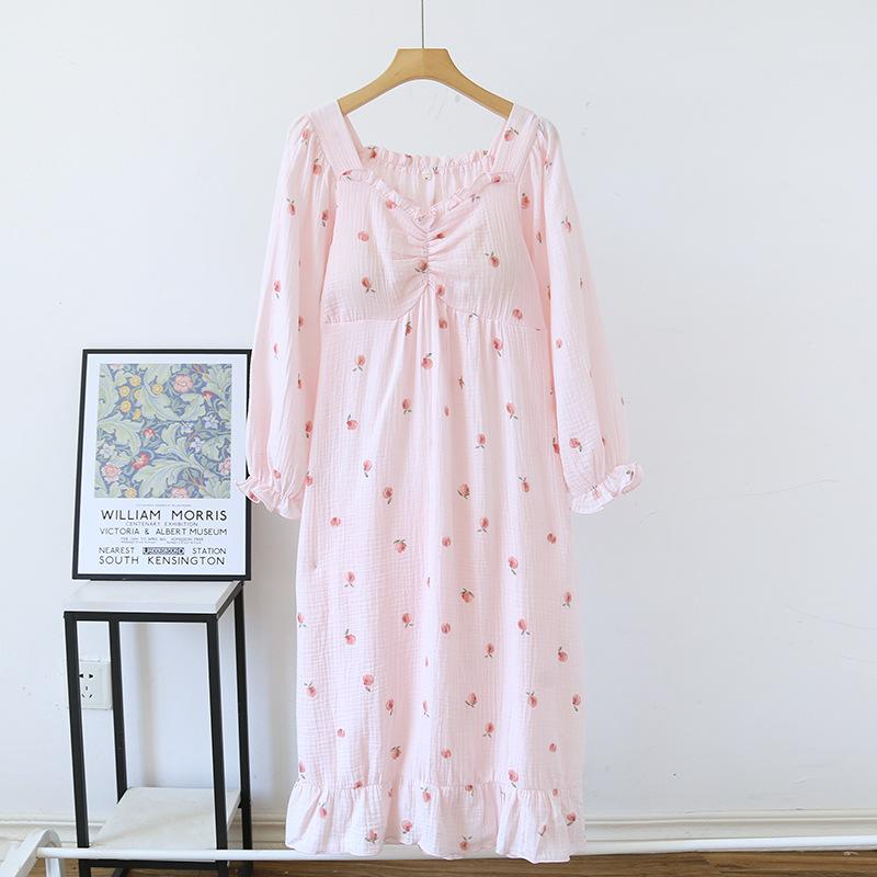 Pijamas casa das mulheres vestido de noite de mangas compridas com almofada peito crepe algodão gaze doce fino suor absorvente vestido midi atacado
