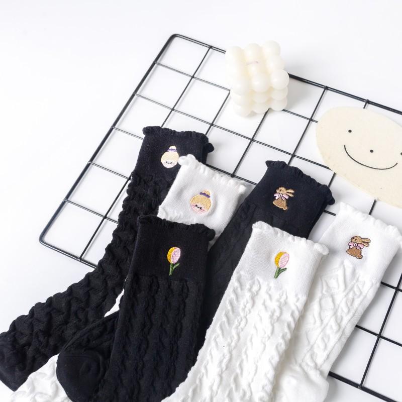 Compre Meias femininas primavera e verão novas preto e branco clássico cor bordado fino meias médias empilhadas meias japonesas fofas no atacado no Joom.pro