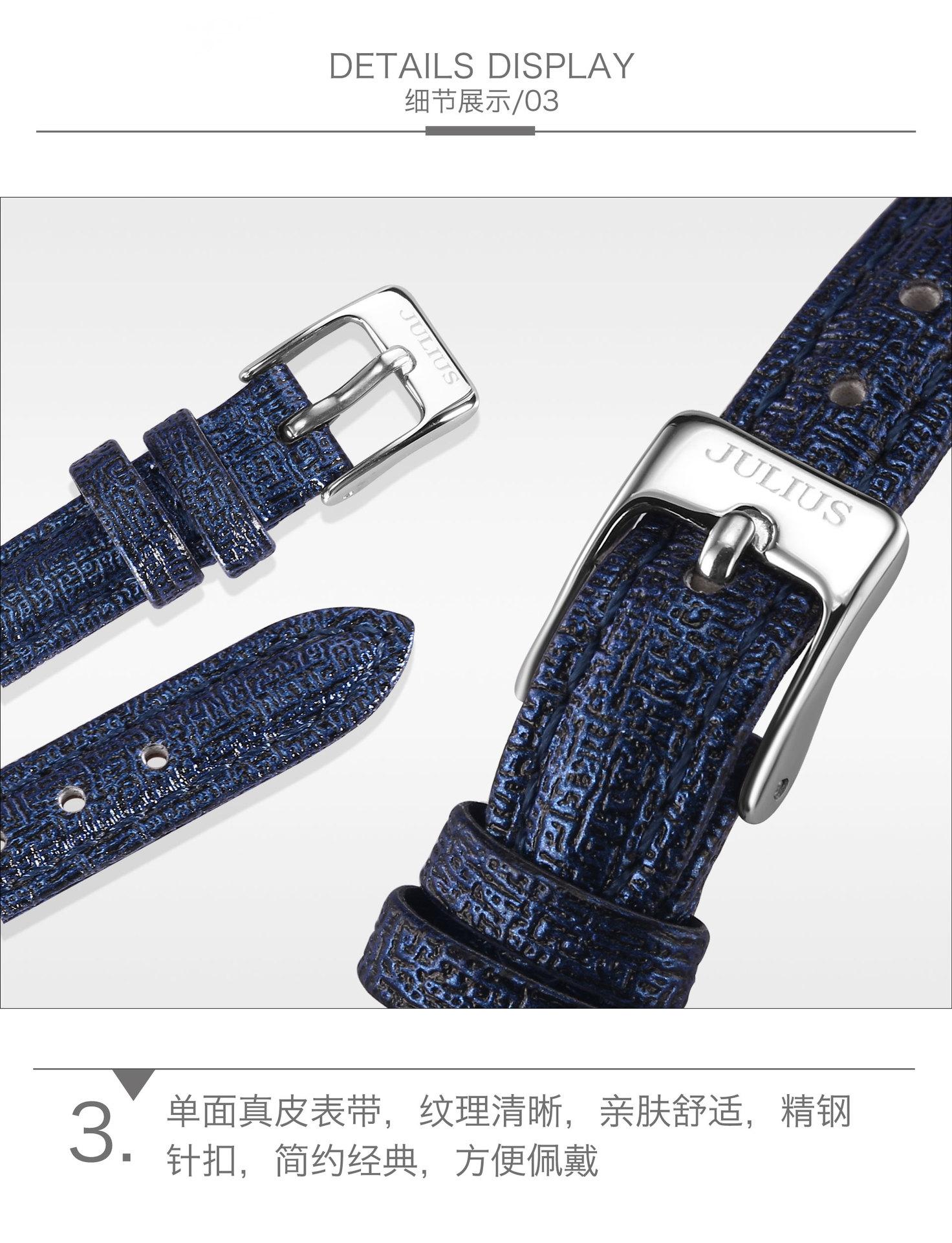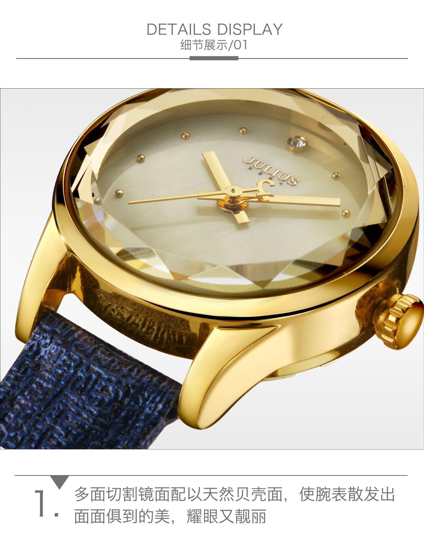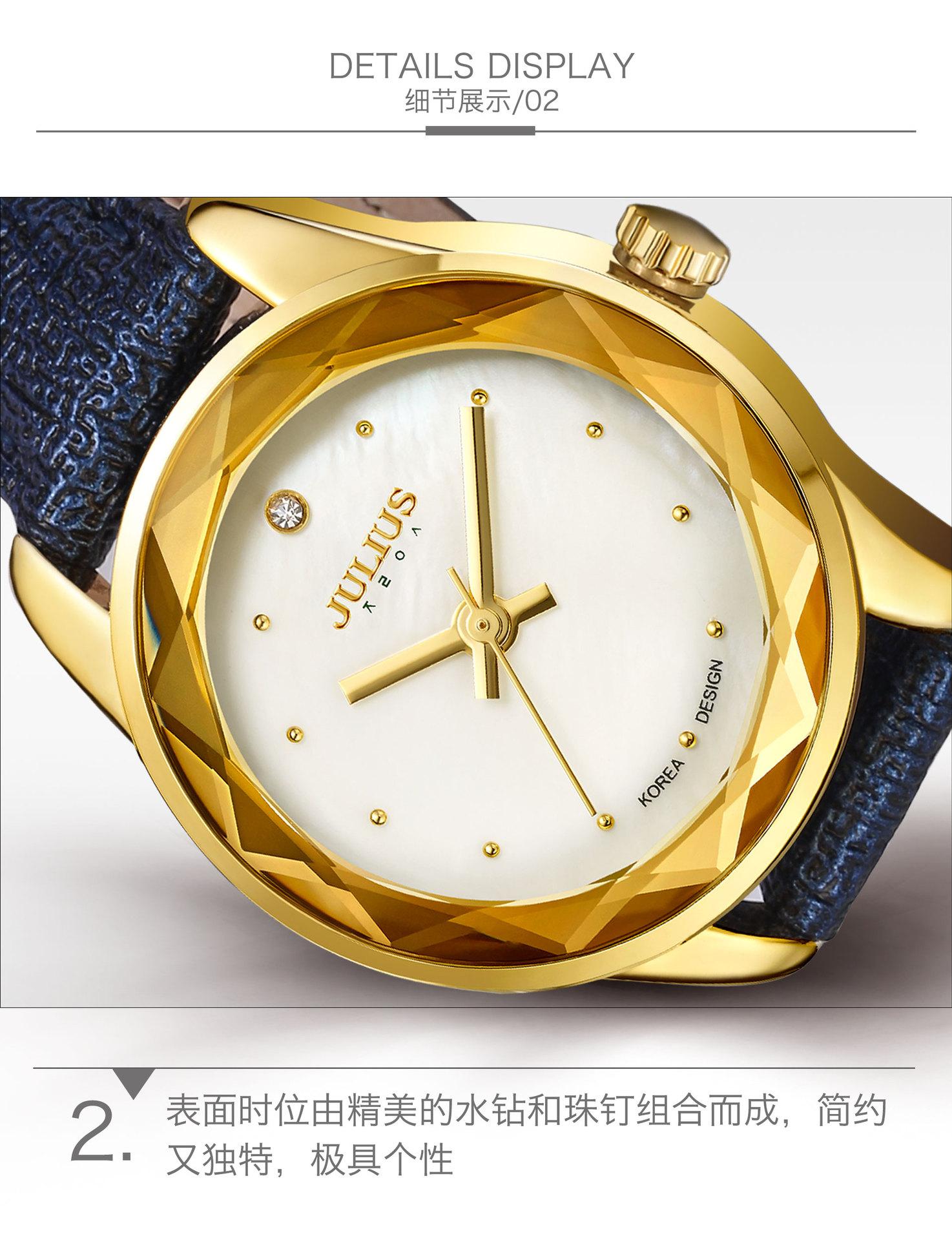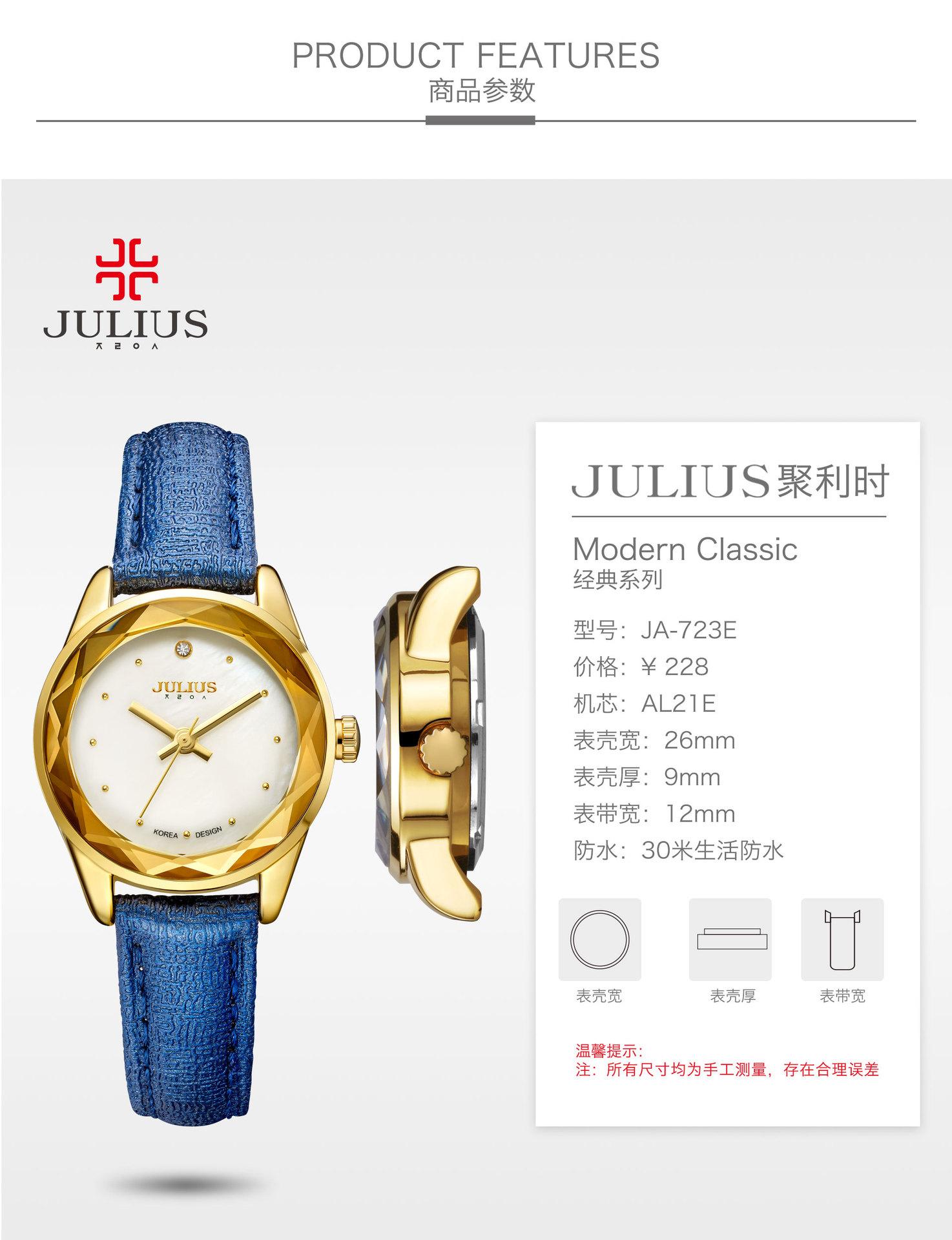 O significado da marca JULIUS é Alegre, Único, Amor, Ideal, Incomum e Brilhante, que é um relógio único pelo qual você vai se apaixonar à primeira vista (Just You Will Love Inimitable Unique Special Watch). A marca JULIUS leva esse nome e possui 7 séries principais (série clássica, série pulsante, série de pulseira, série de exploração, série de casal, série masculina e série de edição limitada).