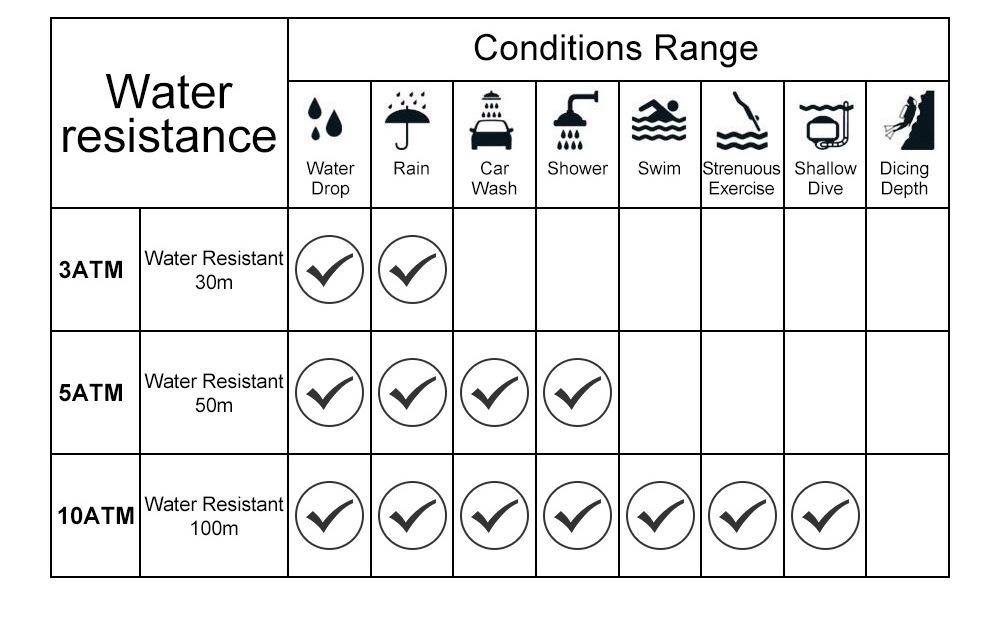 Observação: é à prova d'água para uso diário, mas não pode ser usado para nadar, tomar banho, mergulhar em água ou operar debaixo d'água. Pode suportar garoa e pequenos respingos. Para prolongar a vida útil do relógio, evite o contato com substâncias corrosivas.