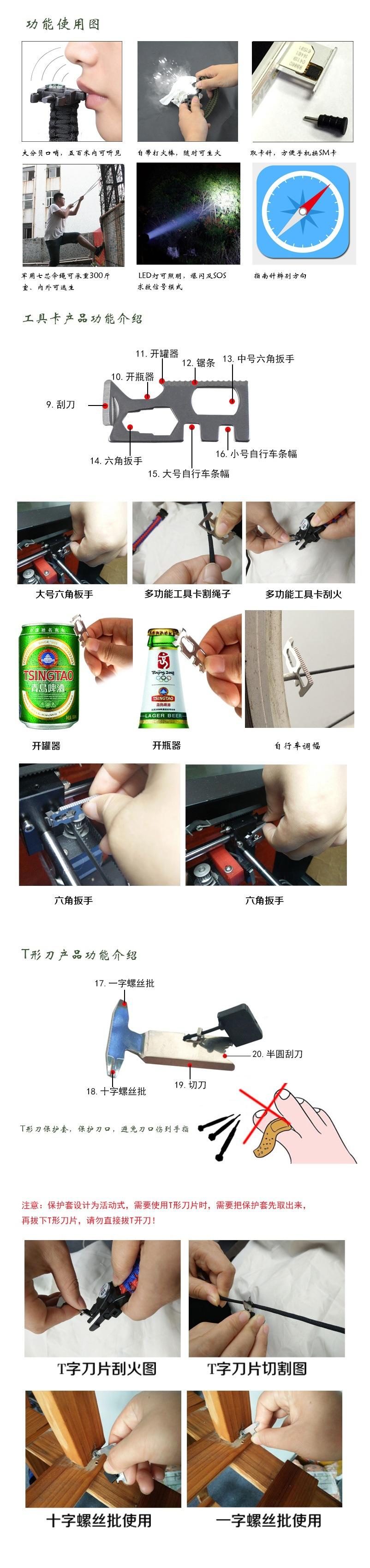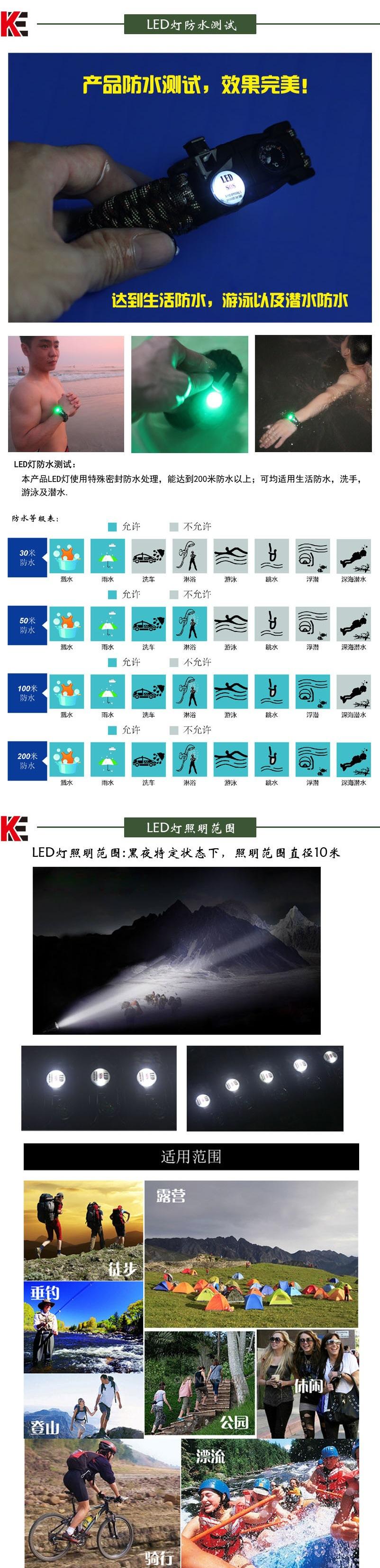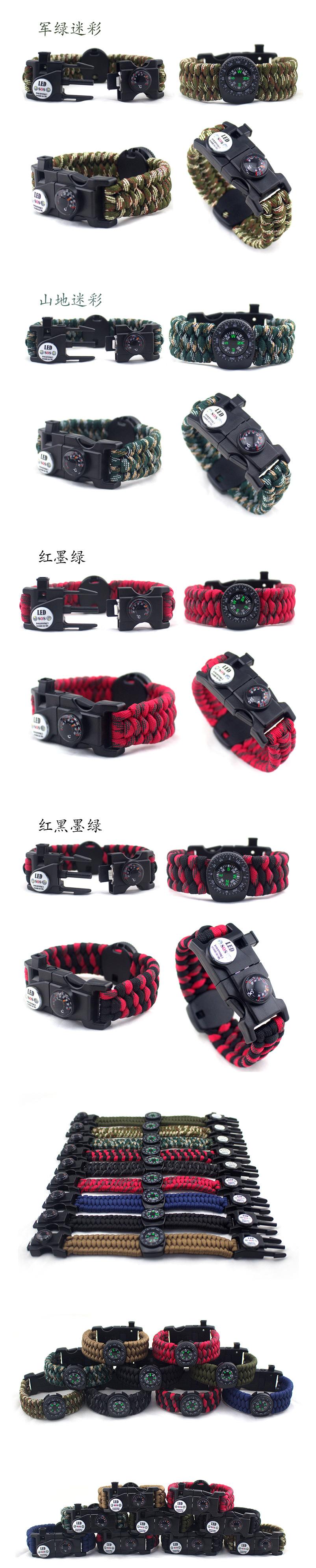 Acessórios de pulseira adequados para uso diário, destacando sua identidade como um jogador ao ar livre, podem ser desmontados e usados como uma corda. Usando a corda de paraquedas de sete núcleos, em uma emergência, ela pode ser usada para parar sangramentos, fazer armadilhas, amarrar tendas temporárias, usar equipamentos para evitar perdas, etc., e pode ser usada para resgate de emergência! A corda do paraquedas tem um diâmetro de 4 mm e uma única tensão de corda de cerca de 113 kg. O comprimento total da pulseira monocromática é de cerca de 3,2 metros quando a corda do paraquedas é desmontada, que é usada para reboque e primeiros socorros. A tensão da corda única é de cerca de 226 catties.