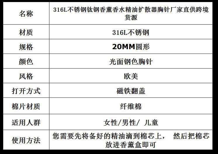 Caixa de aromaterapia com broche magnético de aço inoxidável de 20 mm