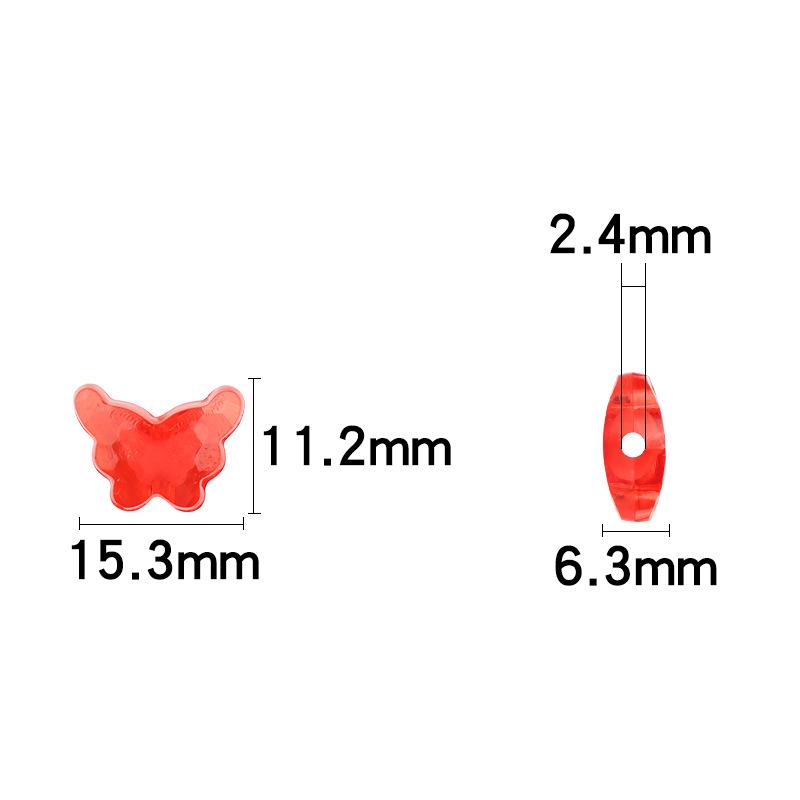 Contas de borboleta facetadas: cerca de 15,3 mm de comprimento, 11,2 mm de altura, 6,3 mm de espessura, diâmetro do furo de 2,4 mm, cerca de 26 g por pacote de 50 unidades