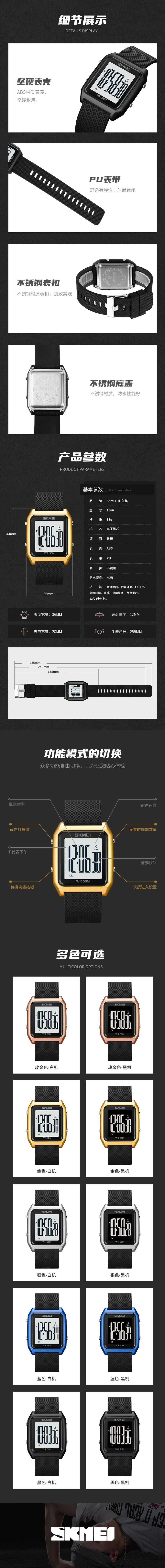 | Material | Caixa de material ABS, pulseira de PU, espelho de vidro, tampa inferior de aço inoxidável, fivela de aço inoxidável |